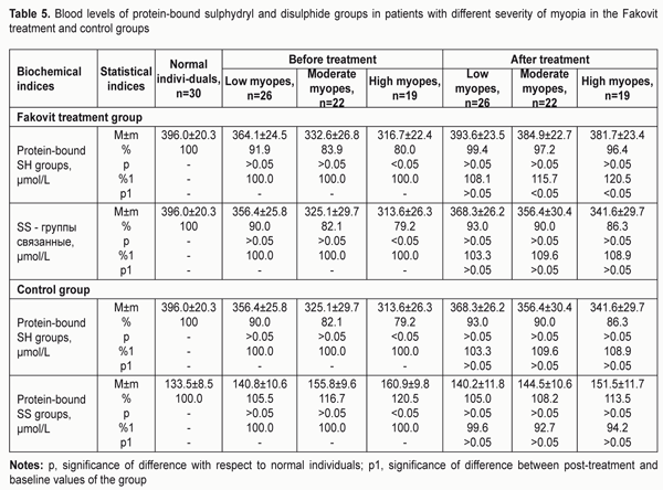 At baseline (before treatment), in the Fakovit treatment group, only high myopes demonstrated substantially (22.7%) and significantly (p < 0.05) lower levels, whereas low and moderate myopes demonstrated insubstantially (7.1% and 15%, respectively) and significantly (р > 0.05) lower blood levels of free sulphydryl groups compared to normal individuals (815.5±52.3 ?mol/L). After treatment with Fakovit, in high, moderate and low myopes, the blood levels of free sulphydryl groups increased by 28.3% (p < 0.05), increased by 15.3% (p < 0.05), and and did not change (p > 0.05), respectively, compared to baseline. At baseline (before treatment), in the Fakovit treatment group, only high myopes demonstrated substantially (20.4%) and significantly (p < 0.05) higher levels, whereas low and moderate myopes demonstrated insubstantially (10.2% and 14.9%, respectively) and insignificantly (р > 0.05) higher blood levels of free disulphide groups compared to normal individuals. After treatment with Fakovit, in low, moderate and high myopes, the blood levels of free disulphide groups decreased by 7.2% (р > 0.05), 11.4% (p < 0.05), and 16.2% (p < 0.05), respectively, compared to baseline. In addition, Table 4 demonstrates that, at baseline, in the control group, only high myopes demonstrated significantly (p < 0.05; 22.9%) lower levels, whereas low and moderate myopes demonstrated insignificantly lower levels of free sulphydryl groups in the blood compared to normal individuals. After conventional treatment of myopia, the blood levels of free sulphydryl groups did not change (р > 0.05). In low, moderate and high myopes of the control group, the blood levels of free disulphide groups were insignificantly (11.5%, 17.2% and 21.1%, respectivly; p > 0.05) higher than in normal individuals at baseline, and changed insignificantly after treatment. Overall, the data of Table 4 demonstrate that treatment of myopia with the tiol agent promotes normalization of the sulfur-containing protein component of the balance between LPO and AOS, with a decrease in the oxidized thiol levels (seen through free SH and SS group levels) in moderate anf high myopes, whereas conventional myopia treatment has no effect on these parameters. Protein-bound SH and SS groups represent thiol and disulphide bonds in protein structures, and are a key component of the antioxidant defense. Table 5 presents the blood levels of protein-bound sulphydryl and disulphide groups in patients with different severity of myopia in the Fakovit treatment and control groups.