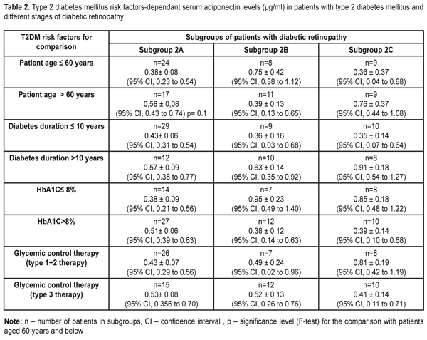 The minimal values for mean serum adiponectin levels among patients aged 60 and below were observed in patients with proliferative DR whereas among patients aged above 60, they were observed in patients of Subgroup 2B. Additionally, the minimal (worst) values for mean serum adiponectin levels (and their CIs) were observed in patients below 60 with proliferative DR and the maximal (best) values for mean serum adiponectin levels were also observed in proliferative DR in patients above 60. Mean serum adiponectin levels trended to be increased in the patients aged 60 and below compared with the older group. Analysis of serum adiponectin levels in patients with different stages of DR in dependence on the duration of diabetes showed the lowest values for mean serum adiponectin levels among patients with duration of diabetes of less than 10 years (and CIs) in Subgroups 2B and 2C and among patients with duration of diabetes of more than 10 years in Subgroup 2A. The highest mean serum adiponectin levels were noted in proliferative DR patients with duration of diabetes of more than 10 years. The lowest mean serum adiponectin levels (hypoadiponectinemia) among diabetic patients with HbA1C ? 8% were observed in patients of Subgroup 2A, whereas among diabetic patients with HbA1C > 8% they were observed in patients of Subgroup 2B. And the lowest (worst) serum adiponectin level was noted in patients with HbA1C > 8% of Subgroup 2B, whereas the highest (best) one was observed in patients with HbA1C ? 8% of Subgroup 2B. Statistically significant difference (р=0.007) was revealed when comparing Subgroup 2A with Subgroup 2B+2C for HbA1C ? 8%, 0.38±0.09 µg/ml vs 0.89±0.14 µg/ml, respectively, (р=0.007) and when comparing Subgroups 2B+2C for HbA1C ? 8% and HbA1C > 8%, 0.89±0.14 µg/ml vs 0.39±0.11 µg/ml, respectively, (р=0.007). Decreased serum adiponectin levels among diabetic patients with HbA1C > 8% could advance the mild non-proliferative stage of diabetic retinopathy to subsequent stages. A type of glycemic control therapy for T2DM did not have statistically significant effect on mean serum adiponectin levels in all DR stages studied. The lowerst values of mean serum adiponectin levels among patients with type 1 and type 2 glycemic control therapy (oral glycemic control agents) were observed in Subgroup 2A and among patients with type 3 glycemic control therapy (metmorfin and insulin therapy) they were observed in proliferative DR patients of Subgroup 2C. In general, the best (highest) mean serum adiponectin levels were observed in proliferative DR patients taking tablet agents and the worst ones were in patients getting insulin therapy. Discussion Diabetic retinopathy is one of the main complications of diabetes mellitus and the leading course of blindness in working age persons in developed industrial countries [32]. DR has high incidence rates and refers to neovascular eye diseases including retrolental fibroplasias (retinopathy of prematurity) and age-related macular degeneration, in which new vascular formation occurs under hypoxia or metabolic abnormalities which affect energy transfer. A lot of factors (insufficient control of blood glucose level, hypertony, dyslipidemia) have been found to have an effect on progression of diabetic retinopathy; kidney diseases are also important in this regard and can contribute to DR development [14, 18, 34]. Although the duration is the most important risk factor (as for DR) [14], not all patients with insufficient glycemic control developed retinopathy (especially its proliferative stage) over time. And, contrary, strict glycemic control is not always able to prevent from DR development. However, researchers share the same opinion that duration of diabetes mellitus and degree (severity) of hyperglycemia are the main risk factors for DR development [2]. Results of some studies using a family cluster principle assume that there are additional components that have an effect on sensitivity to chronic hyperglycemia, in particular, a hereditary factor [7] and, based on to-date data, hormones of adipose tissue (leptin, adiponectin, resistin, etc.). Adiponectin (APN, also called Acrp30, apM1) is a protein which is secreted by adypocytes, with the most abundant gen transcript 1 (apM1) [22], plays an important role in formation of antiatherogenic anti-inflammatory agents and insulin [6, 8, 31, 33], controls insulin sensitivity of tissues, and can also be involved in non-specific inflammation process [16, 17, 36], being a significant modulator of metabolic disorders and vascular diseases. Our analysis of the hormonal predictors (like adiponectin, an adipose tissue-specific hormone) of diabetic retinopathy development revealed that patients with mild non-proliferative DR had somewhat lower (worst) adiponectin levels among patients aged 60 and below with DM subcompensation. The lowest serum adiponectin levels were common for moderate to severe non-proliferative DR among T2DM patients aged above 60 with duration of diabetes of 10 years or less and with T2DM compensation. Among T2DM patients with proliferative DR, the worst serum adiponectin levels were common for T2DM patients aged 60 and below with duration of diabetes of less than 10 years and with T2DM compensation. Considering statistic values of serum adiponectin levels for this stage, it should be noted that, for conditionally combined proliferative DR and severe and moderate non-proliferative DR, statistically significant changes (р=0.007) consisted in the decreased serum adiponectin levels in T2DM compensation. Analyzed the finding of the present study, we can conclude that the decreased adiponectin levels are common for all stages of DR and have somewhat distribution characteristics due to risk factors and a stage of the disease. The absence of the protective effect of adiponectin makes vascular walls unprotected, which may contribute to DR development at early stage (mild proliferative DR) in patients ag