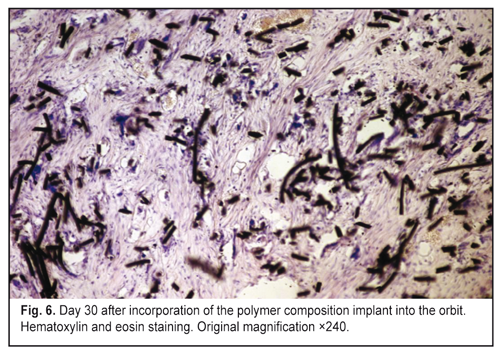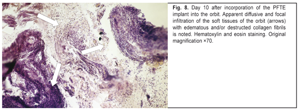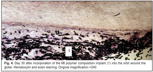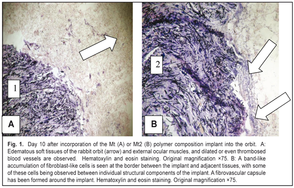 https://doi.org/10.31288/oftalmolzh201765764 Responses of the rabbit’s soft tissue of the orbit and periorbital area, and orbital bone structures to the introduction of the polymer composition implant and PFTE implant N.M. Bigun1, V.V. Vit2, A.P. Maletskiy2, V.I. Dubkova3 1Lviv Regional Clinical Hospital, Ukraine 2Filatov Institute of Eye Disease, Odesa, Ukraine 3MEDBIOTECH LLC, Minsk, Republic of Belarus E-mail: maletskiy@filatov.com.ua Background: The synthetic polymer materials to be used in plastic and reconstructive surgery for craniofacial injuries should have high compatibility with biological tissues. In cooperation with MEDBIOTECH LLC (Republic of Belarus), we have developed a carbon-polymer composite with thermo- and electrophysical characteristics close to those of viable biological tissues. Purpose: To investigate experimentally the responses of the soft tissue of the orbit and periorbital area, and orbital bones to the polymer composite implants (PCI) and polytetrafluoroethylene (PFTE) implants. Materials and Methods: Chinchilla rabbits received one of the two types of implants, PCI (Mt, Mt1, Mt2 or Mt2+ ceftriaxone versions), or PFTE implants, into the periorbital area, scleral sac, orbital tissue, or auricle tissue. The response of the soft tissues and bone structures to the implants was assessed based on changes in clinical and pathomorphological indices at days 10, 30 and 60. Results: In any type of implant, post-surgical wound healing was found to occur by primary intention. Inflammatory responses of the rabbit’s soft tissue of the orbit and periorbital area, and of the orbital bones to the PFTE implant were more pronounced than those to the PCI. We found histomorphologically that adjacent soft tissues grew into the PCI, and a capsule formed around the PFTE implant. Conclusion: The polymer composite implants were found to have improved biocompatibility compared to polytetrafluoroethylene implants. Keywords: periorbital area, scleral sac, auricle tissue, reconstructive surgery, polymer composite, polytetrafluoroethylene, experiment