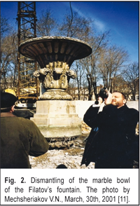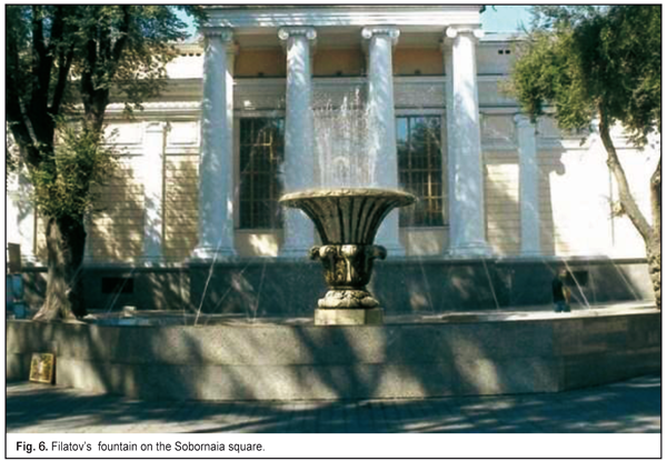 In 2003, the General Assembly of the Black Sea Orthodox Fund decided to merge the two fountains – a new fountain was reconstructed with the bowl of Filatov’s fountain on the historical site of the old fountain (Figure 6). The fountain is still located before the altar of the recovered Transfiguration Cathedral (Figure 7). In September 2004, when the 210th Anniversary of Odessa was celebrated, the fountain was grandly opened and blessed. Popularly, it has got the name of Filatov’s fountain. The Institute’s workers and all involved Odessa citizens hope that thin name will officially be fixed and registered in all guidebooks of the city.