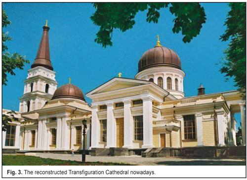 Historical reference. The Transfiguration Cathedral is special among churches of Odessa since it is the largest Orthodox Church in Southern Ukraine. It was founded in 1794 and consecrated in 1808 [7, 12]. On reconstruction the Cathedral Chapel was re-consecrated in 2001, the Lower Churcha and the Upper Church were consecrated in 2002 and 2003, respectively. The Transfiguration Cathedral is situated on the central square of Odessa which is called Sobornaia after the name of the church on it.