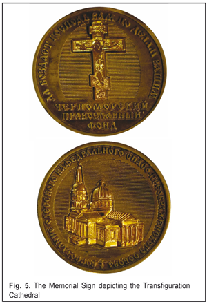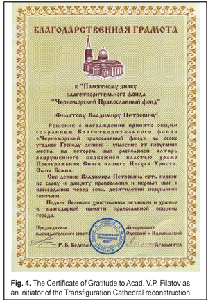 Academician V.P. Filatov was posthumously awarded the Certificate of Gratitude as the first participant of the Church’s reconstruction (Figure 4), in which his civil feat was described in details: “for an act particularly pleasing to the Lord - salvation from the desecration of the place where the altar of the Church of the Transfiguration of Our Savior, Jesus Christ, the Son of God, was destroyed by the godless government. This act of Vladimir Petrovich is a feat and the first step to the re-creation in seven decades of the desecrated Sanctuary”. In addition to the Certificate, there was the Memorial Sign, a medal depicting the Cathedral (Figure 5); both the Medal and the Certificate are reposed in the Filatov Museum and Exhibition Complex [9]. The Academician was not frightened to behave like this at that scary time, after all, the work of all his life – the creation of the scientific research institute worthily named after him – could be at risk.