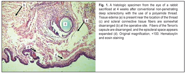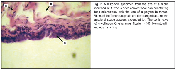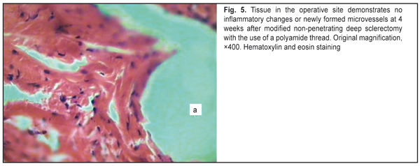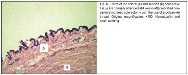 Therefore, in the slides of the animals of Group 4, the inflammatory changes were less pronounced than those observed for the animals of Group 3, and were attributable to the use of the dissection of the conjunctiva, episcleral diathermocoagulation, and formation of the inrascleral tunnel without cutting a superficial scleral flap. We would like to highlight several points related to the glaucoma surgery technique which promote postoperative scarring, thus decreasing the hypotensive effect. In conventional non-penetrating deep sclerectomy, the bleb is formed at the operative site, i.e., it is located in the same area as the operative site. That means that bleb formation will be directly associated with the amount of intraoperative trauma. The amount of intraoperative trauma, in its turn, depends on the surface area of dissection of the conjunctiva from the episclera, amount and power of episcleral diathermocoagulation, and the size of the scleral flap. These manipulations are performed in the area of subsequent bleb formation, and thus influence scarring in the area [3, 7-10]. Intraoperative use of diathermocoagulation leads to marked local inflammatory response with massive cellular tissue infiltration, thus resulting in a longer reparative period for the operative area, and, consequently, in increased scarring of newly formed aqueous outflow pathways [11]. In addition, the surface area of separation of the conjunctiva from the episclera influences the subsequent size and shape of the bleb, as the velocity and amount of fluid resorbed through the conjunctival and episcleral vessels are higher in diffused blebs [12]. Studies on scarring at the operative site have demonstrated that, in conventional NPDS, the superficial scleral flap is involved in postoperative inflammation with subsequent cicatrization, thus resulting in deformation of the flap with obstruction of the intrascleral cavity [13]. We have developed the basic technological principles of modified non-penetrating deep sclerectomy (isolation of the filtering site from the operative site; no need for creating a superficial scleral flap or using diathermocoagulation at the filtering site; forming an intrascleral pocket; and the potential using of various drainage devices) in order to prevent excessive scarring at the filtering site. Conclusions First, the technique of modified non-penetrating deep sclerectomy reduces postoperative bleb scarring and results in a shorter reparative process at the filtering site compared to that in conventional non-penetrating deep sclerectomy. Second, extensive dissection of the conjunctiva from the episclera as well as episcleral diathermocoagulation results in a longer reparative process at the operative site. Finally, incorporation of either type of drainage device (polyamide thread or Xenoplast) into the intrascleral space results in a stable dilatation of the space and prevents the adhesion between the roof and the bed of the scleral tunnel. References