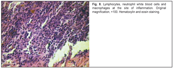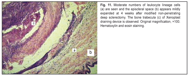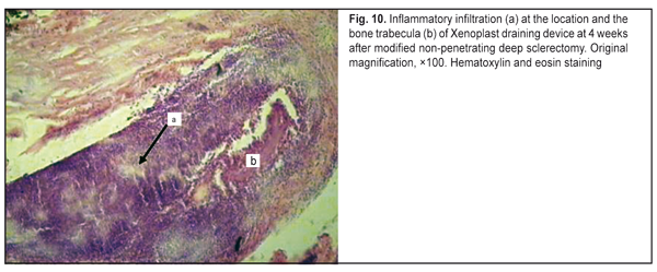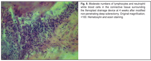 Therefore, in the animals of Group 3, the reparative process was significantly hindered by active exudative inflammation, that is attributable to the use of the dissection of the conjunctiva, episcleral diathermocoagulation, cutting of a U-shaped scleral flap, and the presence of Xenoplast. Group 4 The animals of Group 4 underwent manipulations similar to MNPDS with implantation of a Xenoplast drainage device. In the slides of the animals of this group, mild inflammatory changes were observed, with lymphocytes and neutrophil white blood cells but not macrophages seen in the operative site (Fig.9). Although leukocyte lineage cells were found to fill all the gaps in between the bone trabeculae of the draining device (Fig. 10), they were present in small numbers in adjacent tissues (Fig. 11). Numerous fibroblasts and moderate numbers of fibrocytes were seen in the connective tissue. Disorganisation of connective tissue fibers was less apparent than in Group III, and the episcleral space appeared mildly expanded.