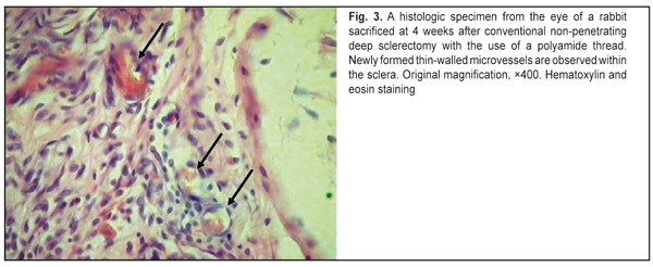 https://doi.org/10.31288/oftalmolzh201765056 Experimental substantiation of modified non-penetrating deep sclerectomy for primary open-angle glaucoma E.A. Ivachev, Ophthalmologist Railroad Clinical Hospital at the Penza station, Russian Railways JSC E-mail: eivachov1@yandex.ru Background: Excessive bleb scarring is the main cause of reduced hypotensive effect after conventional non-penetrating deep sclerectomy (NPDS). We have developed a modification of NPDS with implantation of a drainage device to reduce this scarring. Purpose: To investigate morphologically the inflammatory response and scarring at the operative site after conventional NPDS and modified NPDS (MNPDS) with implantation of different drainage devices in rabbits. Materials and Methods: The animals of Groups I and 3 underwent manipulations similar to conventional NPDS (with implantation of either a 5-0 polyamide thread or Xenoplast drainage device, respectively), whereas those of Groups 2 and 4 underwent manipulations similar to MNPDS (with implantation of either a 5-0 polyamide thread or Xenoplast drainage device, respectively). Results: At week 4, the reparative process in the animals of Group 1 was not yet complete (with insubstantial inflammatory changes still present, mostly around a foreign body), whereas that in the animals of Group 2 was practically complete. In addition, in the animals of Group 3, the process was significantly hindered by active exudative inflammation, whereas in the animals of Group 4, the inflammatory changes were less pronounced. Conclusion: The technique of MNPDS reduces postoperative bleb scarring and results in a shorter reparative process at the filtering site compared to that in conventional NPDS. Extensive dissection of the conjunctiva from the episclera and episcleral diathermocoagulation result in a longer reparative process at the operative site. Incorporation of either type of drainage device (polyamide thread or Xenoplast) into the intrascleral space results in a stable dilatation of the space and prevents the adhesion between the roof and the bed of the scleral tunnel. Keywords: glaucoma, surgical treatment, non-penetrating deep sclerectomy, morphologic changes at the operative site Introduction Non-penetrating glaucoma surgery is a popular approach to lowering intraocular pressure. Although conventional non-penetrating deep sclerectomy (NPDS) has a number of advantages (like microinvasiveness, low complication rate, and controlled intraoperative IOP reduction), ocular hypertension is common after this procedure. Aqueous humor passes through the intrascleral channel into the subconjunctival space, thus forming a bleb. Some studies have demonstrated that the subconjunctival pathway is a leading aqueous outflow pathway [1, 2] after conventional NPDS. Excessive bleb scarring is the main cause of reduced hypotensive effect after NPDS. Inflammatory response to surgical intervention in the presence of glaucomatous changes in the ocular tissues leads to accelerated scarring of the newly formed aqueous outflow pathways, thus resulting in recurrent IOP elevation. Bakunina et al [3] proposed to excise the episcleral and conjunctival connective tissue as a source of proliferating fibroblasts during NPDS in order to reduce scarring at the site of aqueous humor filtration. They have reported that the hypotensive effect of their approach has been maintained for up to 3 years. The techniques with the reduced surgical area have been described as an approach for combating excessive scarring at the surgical site [4, 5]. We have obtained a patent for the modified non-penetrating deep sclerectomy (MNPDS) with implantation of a drainage device (Pat. of Russia №2,539,554 issued 10.07.2013) for patients with primary open-angle glaucoma. The method consists in isolating the filtering site from the operative site without the use of coagulation in the absence of a free scleral flap [6]. The purpose of this study was to investigate morphologically the inflammatory response and scarring at the operative site after conventional NPDS and MNPDS with implantation of different drainage devices in rabbits. Materials and Methods Animal studies were conducted at the vivarium of the Penza State Agricultural Academy. All animal experiments, care and handling were performed in compliance with Directive 2010/63/EU of the European Parliament and of the Council of 22 September 2010 on the Protection of Animals Used for Scientific Purposes, and Order No. 267 of the Russian Ministry for Health of 19 June 2003 on Approval of Regulations for Laboratory Practice. Twenty Chinchilla adult male rabbits, divided into four groups of five animals each, were used in this experimental study. The animals of Groups I and 3 underwent manipulations similar to conventional NPDS (with implantation of either a 5-0 polyamide thread or Xenoplast drainage device, respectively), whereas those of Groups 2 and 4 underwent manipulations similar to MNPDS (with implantation of either a 5-0 polyamide thread or Xenoplast drainage device, respectively). Polyamide thread is a synthetic nonabsorbable suture material that measures 0.100-0.149 mm in diameter, with no reaction in the adjacent tissue. Xenoplast drainage device is made of porous collagen derived from bone tissues of agricultural animals. It measures 4.0?1.5?0.5–0.8 mm, and is nonabsorbable, non-toxic and immunogenic. In both eyes of Group 1 rabbits, the conjunctiva was dissected from the episclera, and a high-frequency electrosurgical unit Fotek E80 was used in bipolar coagulation mode (exposure duration, 0.5 s; power setting, 3 W) to produce 20 coagulation lesions at the episcleral surface. A 5x5 mm scleral flap including one-third of scleral thickness, was separated from the sclera, and a 5-0 polyamide thread was placed underneath it. Thereafter, this area was covered with the bulbar conjunctiva that was secured with a running suture. Both eyes of Group 3 rabbits were subjected to the same 