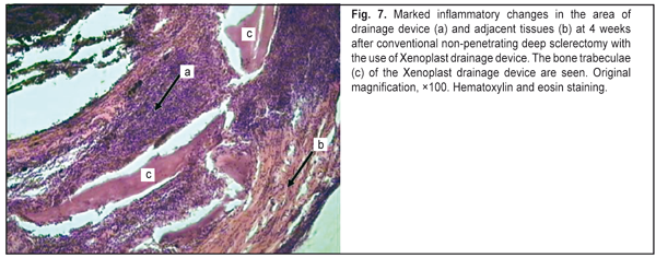 Therefore, these slides give evidence that, after MNPDS with the use of a polyamide thread, the reparative process in the rabbit’s eye were rather fast, and, by week 4, were practically complete. This is attributable to (a) the absence of the use of the dissection of the conjunctiva or episcleral diathermocoagulation, and (b) shaping of the intrascleral tunnel without cutting a superficial scleral flap. Group 3 The animals of Group 3 underwent manipulations similar to conventional NPDS with implantation of a Xenoplast drainage device. Marked inflammatory changes were found in the specimens from these animals. Leukocyte lineage cells were found to fill all the gaps in between the bone trabeculae of the draining device (Fig. 7) and to infiltrate a large connective tissue area surrounding the device (Fig. 8). There was separation of fibers of scleral and Tenon’s connective tissue that appeared acutely edematous, and the episcleral space appeared expanded.