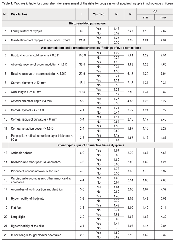 An analysis of 30 potential risk factors for progression of acquired myopia was conducted. These potential risk factors were divided into three categories:  anamnestic data, accommodation and biometric parameters of the eye (based on the eye examination), and phenotypic signs of connective tissue dysplasia (CTD). The values of informativeness index (I) were calculated for each factor. The factors with I values less than 2.0 were excluded from further analysis. In this way, we selected 22 potential risk factors for progression of acquired myopia. These factors along with their levels (Yes/ No) and relative risk index (R) values (that depend on the power of the factor) were used to create a prediction table for comprehensive assessment of the risk for progression of acquired myopia in school-age children (Table 1).