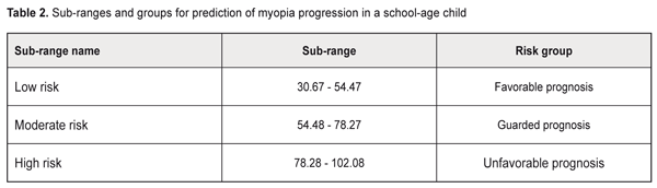 Second, the use of the prognostic table proposed allows easy identification of school-age children at risk for the progression of myopia, with subsequent development of customized diagnosis and treatment plans.