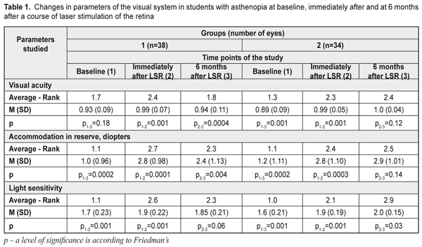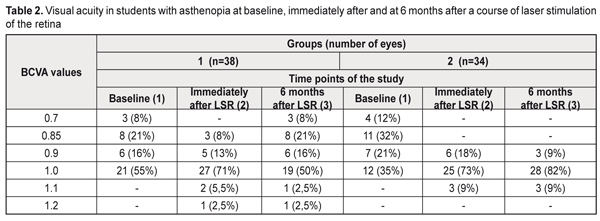 Table 1 demonstrates that at baseline and at 6 months of nutrient supplements there was a statistically significant increase (χF2=46.3; p=0.00001) in the mean BCVA values in the group 2 patients: after a 6 months nutrient supplementation this value increased by an average 12% in 31 eyes (91%). In group 1, no significant changes were noted within this follow-up period. No significant differences between groups in all indices of the functional state of the visual system before and immediately after a course of LSR were noted. Accommodation measurements showed the absence of reserve of accommodation in 14 eyes (37%) in group 1 and in 12 eyes (35%) in group 2 (Table 3). After a LSR course, the accommodation reserve values increased in all students: to 2.8 (SD, 0.98) D, i.e. by 1.8 D, in group 1 and to 2.8 (SD, 1.10) D, i.e. by 1.6 D, in group 2 (Table 1).