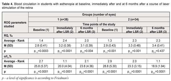 At 6 months after a course of LSR, the reserve accommodation values decreased to 2.4 (SD, 1.13) D, i.e. by 14%, in group 1 while, in group 2, an insignificant increase to 2.9 (SD, 1.01) D was noted as compared with the post-LSR values of resrve of accommodation. After 6 months of nutrient supplementation, the mean reserve accommodation values statistically significantly increased in the group 2 students (χF2=54.5; p=0.0001): this index was > 3D in 73% vs. 54% of the group 1 students. Light sensitivity of the macula (LSM) which reflexes compensatory and adaptive mechanisms of the afferent system also improved after a course of LSR in both groups: by 12% and 18% in group 1 and 2, respectively (р<0.001). 6 months after a course of LSR, LSM 7 minutes into the study increased to 2.0 (SD, 0.15) (р<0.001), i.e. by 25%, in 82% of the group 2 students; while, in group 1, this index decreased to 1.85 (SD, 0.21) and was within the normal ranges only in 47% of the students. As it can be seen in Table 1, at 6 months of the supplementation with a vitaminous antioxidant complex, the students of group 2 had a statistically significant increase of light sensitivity of the macula (χF2=62.5; p=0.00001), which was confirmed by the increased mean LSM values, at average by 25%: after a 6-month nutrient supplementation, the LSM values reached the normal ranges in 28 eyes (82%). In group 1, by 6 months, the LSM values reached the normal ranges in 18 eyes (47%), which is 1.7 times less than in group 2. RQ blood circulation in the eye after a course of LSR improved, at average, by 14% in both groups: by 3.2 (SD; 0.38) ‰ and 3.3 (SD; 4.48) ‰, in group 1 and 2, respectively (Table 4). At 6 months, no significant changes in blood circulation were noted in the groups. Based on the literature data, the improved working capacity of the ciliary muscle is directly related to improved hemodynamics in the ocular vessels. Insufficient blood supply is one of the main mechanisms leading to impaired accommodation. Studies by T.N. Kisileva and colleagues (2013) have shown a significant increase of rheography coefficient by 66% and a decrease of asthenopia symptoms after a course of transscleral laser stimulation of the ciliary body [26]. At baseline, vascular spasm was revealed in 95% of the group 1 students and in 97% of the group 2 students. After a course of LSR we noted a significant improvement of the tone of intraocular vessels (α/t1) by 22% and 19%, i.e. to 20.0 (SD; 4.04) % and 23.3 (SD; 3.15) %, in the students of group 1 and 2, respectively (p<0.001) (Table 4). Studies at 6 months after LSR revealed a further decrease in the tone of the intraocular vessels to 18.9 (SD; 1.94) %, i.e. by 19%, in 59% of the group 2 students (p<0.05), while in the group 1, the spasm of the intraocular vessels increased to 23.8 (SD; 4.36) % (p>0.001), i.e. by 19% (p>0.001). Hence, during the whole follow-up period, the intraocular vascular spasm decreased by 34% in the students of group 2 (p<0.001). As it can be seen in Table 4, 6 months of a nutrient supplementation resulted in a significant increase in the mean values of the tone of the intraocular vessels (χF2=62.7; p=0.00001): the normal ranges of the intraocular vascular tone were noted in 20 eyes (59%) in group 2. At 6 months, the vascular spasm was noted in 86 % of the group 1 students.