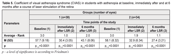 CVAS study results The baseline CVAS corresponded to high asthenopia in 45 % and 35% in the students of group 1 and 2, respectively, and to moderate asthenopia in 55% and 65% in the students of group 1 and 2, respectively. The post-LSR CVAS decreased to mild asthenopia in 53% and 38% of the students, respectively, in group 1 and 2; moderate asthenopia was noted in 47% and 62 % of the students and averaged 30.4 (SD; 3.05) and 32.9 (SD; 6.34) scores, in group 1 and 2, respectively (Table 5). A 6 month nutrient supplementation in group 2 resulted in a shift from moderate to mild asthenopia, to 27.4 (SD; 3.21) scores (p<0.001), in 91% of the students; while in group 1 the CVAS values increased to 43.1 (SD; 8.06) scores, (p<0.001), i.e. by 25%, with the impaired subjective state according to asthenopia pronouncement.