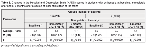 Background. Asthenopia is a key point in information fatigue syndrome. The incidence of asthenopia syndromes (one or several) among students is 57-89.9%. The recent data have evidenced that dietary supplements with a combination of omega-3 fatty acid, bilberry extract and lutein reduce asthenopia symptoms. Purpose. The purpose was to assess the efficacy of a course of laser stimulation of the retina with a subsequent nutrient supplementation in students with asthenopia. Material and Methods. We performed comprehensive examination of 36 students (72 eyes), aged 18 to 25, with asthenopia signs. There were two groups: group 1, 19 students (38 eyes); group 2, 17 students (34 eyes). All study eyes underwent 10 every-day sessions of diode laser stimulation of the retina (LSR) (wavelength, 650 nm; irradiance, 0.4 mW/sm²; treatment timing, 300 s). On completion of a course of LSR, the students of group 2 were recommended a Nutrof®Total vitaminous antioxidant complex, one capsule daily for 6 months. Results. A course of laser stimulation of the retina and a 6 month nutrient supplementation for asthenopia students made it possible to improve visual acuity by 12% in 91 % of the students, to recover the reserves of accommodation over 3 D in 73% of the students, to improve the vascular tone by 34% in 59% of the students and light sensitivity of retinal cones by 25% in 82% of the students; asthenopia graded from moderate to mild in 91% of the students; the overall emotional state was normalized in all students by 37% according to a HADS scale. Conclusions. A course of LSR and a 6 month nutrient supplementation enables to improve students’ overall health and professional activity while reduced asthenopia creates conditions for health improvement, better quality of studying and open career opportunities. Key-words: asthenopia in students, laser stimulation of the retina, nutrient supplementation Background Nowadays, computers, tablets, and smarthones are widely used, which has induced psychophysical problems in students worldwide. Students comprise a large group of intellectual workers and this work requires efforts of vision, memory, attention, and mental processes. This leads to the violation of rest and meals regimen, over-fatigue, performance impairment, and development of psychosomatic disease. So, the issues of students’ health maintenance and disease prevention are becoming more and more relevant today. Asthenopia is a key point in information fatigue syndrome. According to domestic and foreign literature, asthenopia occurs in 60-90% of display uses [1, 2]. The incidence of asthenopia syndromes (one or several) among students is 57-89.9% [3, 4, 5]. Besides, an overuse of smartphones can cause such problems as blurred vision while reading, double vision, eye dryness, and neck, wrist, or back pain [5, 6, 7]. In particular, fatigue related to prolonged work at a computer display is defined as computer vision syndrome (CVS) [8, 9, 10] with ocular symptoms and musculoskeletal symptoms (neck and shoulder pain). The main CVS symptom is asthenopia which, sometimes, is painful for a patient and affects the quality of life [11]. Smartphone constructions are being improved very quickly and high resolution displays can have certain advantages since they provide a brilliant image. However, D. J. Kim and colleagues (2017) have revealed in healthy people a significantly expressed visual fatigue and discomfort which are associated with viewing smart mobile devices with state-of-the-art display technology [12]. According to World Health Organization data (2016), 27 % of European population, which is almost a third, experience anxiety and depression conditions. It has been shown that 45% of smartphone users feel anxiety when they are not holding their smartphone [13]. A world literature review has shown that 11 to 33% of students have sleep disturbances, anxiety, and depression [14, 15]. Asthenopia (eye strain) is characterized by visual symptoms (blurred vision, double vision), ocular symptoms (burning, pain, redness, tearing, nictation, photophobia, and nictitating spasm), and concomitant psycho-emotional disorders (irritation, depression, anxiety, disturbance) [16]. Changes in the accommodative apparatus of the eye lead to impaired accommodative convergence and low fusion convergence [17]. This download trend is increased by blood flow impairment in the ciliary muscle, disorders in regulatory mechanisms of vegetative segmental formations, dystonia of cerebral vessels, mainly of a parasympathetic type, against the background of the low tonus of the sympathetic nervous system. O.A. Gromova et al. (2011) have shown that omega-3 polyunsaturated fatty acids (PSFA) play the leading role in the healthy growth and functioning of the brain and central nervous system [18]. Eicosapentaenoic acid (EPA) and docosahexanoic acid (DHA) are known to have an effect on the lipid spectrum, vascular tone, and blood clotting [19]. Omega-6 PSFA prevails in the food ration of students. Increased consumption of saturated and trans fats (margarine, fried food, French fries, chips etc.) results in disorders in fat metabolism in the body, hormone imbalance, and anxiodepressive symptoms. Normally, an omega-6/omega-3 ratio must be 4:1. However, the consumption of olive oil and fatty fish which are the main source of omega-3 PSFA (EPA and DHA) remains low. In such a dietary regimen, there is a shift towards an increase of omega-6 PSFA, and the omega-6/omega-3 ratio can be 20/1. The recent data have evidenced that dietary supplements with a combination of omega-3 fatty acid, bilberry extract, and lutein reduce asthenopia symptoms [20] and eight week consumption improves some objective and subjective symptoms of eye fatigue induced by visual loads [21]. J.M. Stringham et al. (2017) have determined that a long lasting carotinoid intake leads to a significant increase in optical density of the macular pigment, to a decrease of eye strain a