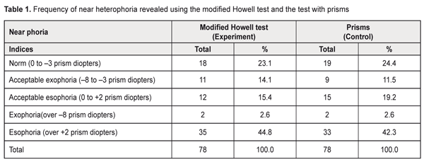 Results. Mean near heterophoria values were 1.37 ± 0.48 prism diopters by the MHT and 1.39 ± 0.48 prism diopters by the control test with prisms, the difference was insignificant (p<0.05). Normal values of near phoria with complete correction were found in 24.4% of cases. Acceptable values of shifts on either side were found in 30.7% of cases. Exophoria was in 2.6%. Esophoria was found in 42.3% of cases. The absence of differences in examination using the HMT and the control test with prisms was found in 39.8% of cases, taking into account standard deviation of ±1 prism diopters in 68% of cases. Deviation of ±2 prism diopters was found in 23.1%; ±3 and above prism diopters in 8.9%. The means of differences between the tests was 1.03±0.12 prism diopters.