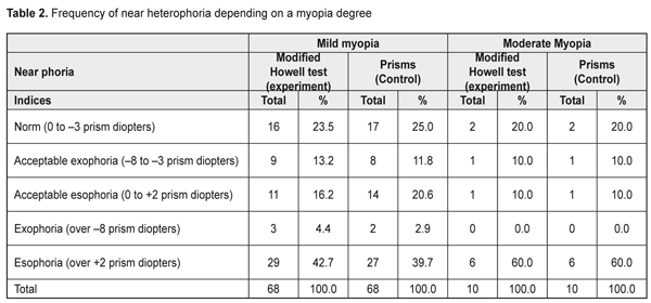 The mean value (M±m) of near heterophoria was 1.37±0.48 and 1.39±0.48 prism diopers for the MHT and the control prism test, respectively, the difference was insignificant (р<0.05); that is why, hereafter, for describing the detected optical setting of the eyes, we used values of the control test as generally accepted in the optometric practice. The normal values of near phoria with complete correction were observed in 24.4% of cases; the acceptable values on either side were in 30.7%, therefore, the acceptable value of shift of the eyes for near was 55.1%. Exophoria accounted for only 2.6%; in most cases, 42.3%, esophoria was detected. The distribution of near heterophoria due to a myopia degree is given in Table 2.