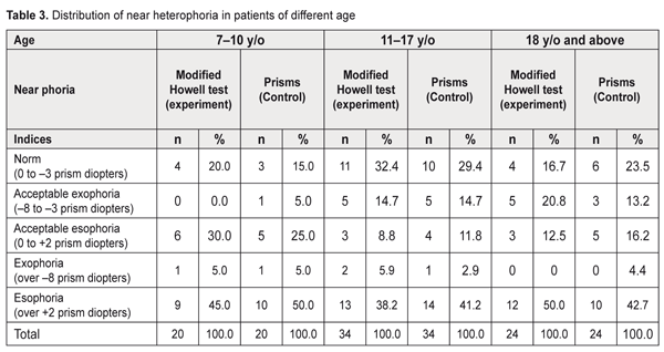 Data on near phoria measurement in patients of different age are given in Table 3.