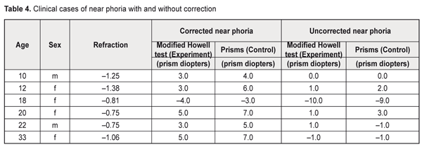 Materials and Methods. During a routine optometric examination, 78 patients with mild and moderate myopia were examined for near phoria using the Modified Howell Test (MHT) and the dissociated test with prisms as a control.