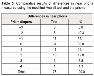 Totally, the absence of differences was detected in 39.8% of cases; difference with standard deviation of ±1 prism diopter [3] was in 68%. Standard deviation in difference of 2 prism diopters was in 23.1%; 3 and above prism diopters in 8.9%. The mean difference between the tests (M±m) was 1.03±0.12 prism diopters. Since the both phoria measurement tests show a certain difference in the values of the same patient [7, 8], the proposed modified Howell test gives results quite comparable to those of the near phoria measurement using prisms.