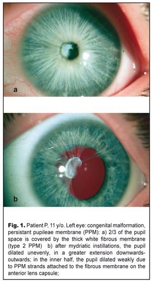 Background. Clinical characteristics, histological structure, and surgical technique of persisting pupillary membrane (PPM) have been presented in the modern literature in insufficient and, in some cases, contradictory reports. Purpose. To describe clinical characteristics and histological structure of PPM, as well as PPM surgery for restoring the transparency of the optic axis and eliminating anisometropia through refractive lens exchange. Material and Methods. Complete ophthalmic examination including ultrasound biometry and scanning followed by surgical removal of PPM and refractive exchange of the clear lens was performed in an 11-year-old patient with high myopia, anisometropia and myopia Results. The PPM case reported is a combination of multiple strands, aligning with the iris in color, involved in the stroma and the inner half of the iris and attached to the anterior lens. The strands, thus, obscured 2/3 of the iris. By sequential surgical dissection of the PPM strands, the membrane was detached from the anterior capsule and removed from the eye. Refractive lens exchange was performed using a standard technique. Histological studies showed a dual character of the removed PPM: the presence of both thick fibrous connective tissue and loose fibrous tissue, resembling the stroma of the iris with the presence of collapsed capillaries. Conclusions. 1. The rare clinical case described is an example of combined type 1 and type 2 PPM according to Duke-Elder’s classification (1964) or a combination of accessory iris membrane and persistant pupilеae membrane. With the point of Duke-Elder’s classification, this membrane can be considered a special variant of type 2 PPM whereas there is no connection with the lens capsule. 2. Attachement of PPM to the anterior lens capsule, which seemed quite tight, was false since PPM, after being dissected, spontaneously detached from the lens with the latter preserved intact and transparent, which contributed to recover the transparency of the optic axis. 3. One-stage refractive replacement of the lens made it possible to eliminate high myopia and high anisometropia, which made it possible to increase visual acuity of the eye and to create maximal favorable conditions for amblyopia treatment that followed. Key-words: persistant pupilеae membrane, refractive lens exchange, children Introduction Persistent pupillary membrane (PPM) develops as a result of embryogenesis disorders, which is a reverse development of tunica vasculosa lentis that supplies nutrition to the lens in the first six month of fetal life [9]. Involution of the central part of the membrane pupillaris occurs at seven or eight months of gestation. Persisting pupillary membrane is observed when this atrophy is incomplete [5]. The reserve development of the membrane also occurs after an infant is born, more intensively during the first year of the life [8]. Remnants of membrane pupillaris as PPM vary in a wide range beginning from thin cobweblike strands seen on a slit lamp to dense straining membranes covering a pupil space and inducing amblyopia [1]. Membrane strands can be connected with the cornea or the lens, but more often with other parts of the iris and between themselves [9]. Incidence of PPM is quite large ranging from 30 to 95% of healthy individuals [1, 8]. Herewith, in most cases, thin strands of the membrane do not affect visual acuity, do not require any treatment, and can be unidentified by the individual. Treatment is required when PPM obscurs the optic zone and visual acuity decreases, which in childhood can be a cause of amblyopia. [2, 14]. We report the case of an 11-year-old adolescent with PPM in an eye with high myopia and anisometropia having led to severe amblyopia. The purpose of the present paper was to describe clinical characteristics and histological structure of PPM, as well as PPM surgery for restoring the transparency of the optic axis and eliminating anisometropia through refractive lens exchange. Material and Methods An 11-year-old adolescent P. was presented at the Ukrainian Centre of Pediatric Ophthalmic Pathology at the Filatov Institute of Eye Diseases and Tissue Therapy. The patient was diagnosed with congenital malformation, PPM, high myopia, anisometropia, and high myopia in the left eye; and emmetropia in the right eye. BCVA OS=0.02–0.03; BCVA OD=1.0. According to the history, patient’s mother repeatedly referred to different ophthalmologists for poor vision in the left eye; however, the patient underwent no treatment. At presentation: the left eye was calm with a transparent and brilliant cornea. The anterior chamber was of an average depth, even and with transparent aqueous humor. A pattern of the iris was smoothed. The pupil was round, 2.5 in diameter, centrally located; 2/3 of the iris were occupied by PPM in a form of a dense fibrous white membrane, 2.5-3.5 mm in diameter, which was tightly attached to the anterior capsule of the lens, occupying 2/3 of the optic zone. An outer half-moon-shaped third of the iris was free (Fig. 1a). The pupil in the inner half dilated unevenly, more extensively downwards-outwards (Fig. 1b), since the PPM strands were strained and there was a fibrous film on the anterior lens capsule which impeded full dilation of the pupil. The lens in the ophthalmoscopically available zone was transparent. Eye fundus: the optic disc was palish, clearly outlined, and surrounded by a thin edge of pigmentation; vessels were narrow; macular reflex was poor; periphery was unchanged.