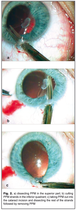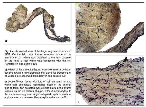 UCVA OS=0.02-0.03; UCVA OD=1.0. Gonioscopy showed in the left eye goniosynechiae on the inside of the anterior chamber angle. IOP OD=21 mmHg; IOP OS= 18.0 mmHg. Tonography: OD 5.5: Р = 13.6; С=0.25; F =0.84; Р0/С =53; OS 5.5: Р = 14.2; С=0.2; F =0.91; Р0/С =73 Ultrasound distance biometry: OD: 3.35 4.01 23.41 mm; OS: 3.12 4.26 26.15 mm. Ultrasound scanning OS: sonography revealed the anterior chamber was of an average deapth, 3.2 mm; the anterior chamber angle of 47˚; single punctate indurations in the lens, 3.6 mm thick, of decreased echogenicity. The papillary edge of the iris was connected with the anterior lens capsule by punctate fibrous structures. The ciliary body was attached. No pathological changes were revealed in the posterior eye. Perimetry: OD: visual field in norm; OS: visual field loss was 10° inside and 20° outside. Refractometry: OD: emmetropia; OS: myopia (-8.0D) Keratometry: OD: 42.0 D; OS: 41.75D Acrysof SN60WF IOL calculations: OD: 22.4D; OS: 15.76D Considering the presence of PPM and high myopia, the patient underwent the removal of PPM with the refractive replacement of the lens and intracapsule IOL implantation in the left eye in order to recover the transparency of the optic axis and to eliminate anisometropia. Excised PPM fragments were histomorphologically studied using hematoxylin and eosin staining. Operational technique: 1% phenylephrine was administered into the anterior chamber; the pupil, therefore, dilated unevenly due to PPM strands going from iris collarettes and attaching to the thick fibrous film on the lens. Anterior-chamber scissors inserted into a 2.2 mm cataract incision were used for visco-dissection of membrane strands from the lens and, afterwards, the membrane strands were dissected, at first, superiorly (Fig. 2a) (leaving some strands uncut) and, then, internally reaching 6 o’clock along the pupillary edge of the iris (Fig. 2b). Herewith, we noted small hemorrhages in the dissection sites of the thickest strands, which indicated the occurrence of persisting vessels in them.