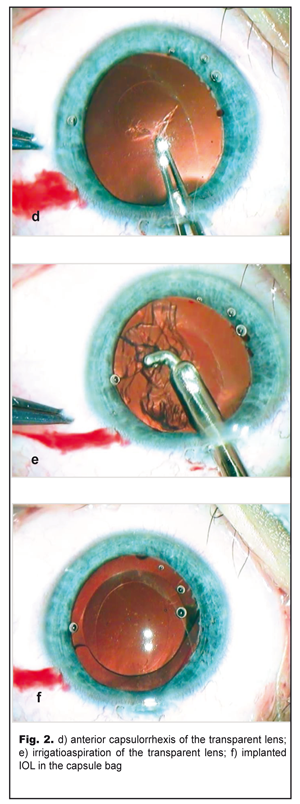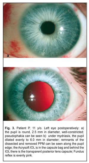 On completion of d=5.5 capsulorrhexis (Fig. 2d) and phacoaspiration of the clear lens (Fig. 2e), an IOL, SN60WF 16.0 D, was implanted into the capsule bag using a cartridge (Fig. 2f). The pupil narrowed symmetrically in response to myotic administration into the anterior chamber; viscoelastic was aspirated and the incision was sutured. The postoperative period was without abnormalities. Results and Discussion The left eye was calm with a clear brilliant cornea, an average depth anterior chamber, and transparent aqueous humor. The round pupil, in the center, constricted well (Fig. 3a) and evenly dilated by mydriatics to 6.0 mm; herewith, bases of the dissected PPM strands could be seen along the inner edge of the pupil (Fig. 3b). The Acrysof IOL was correctly placed in the capsule bag; behind the IOL there was a transparent anterior capsule. The eye fundus reflex was even and pink with details in norm. IOP was normal.