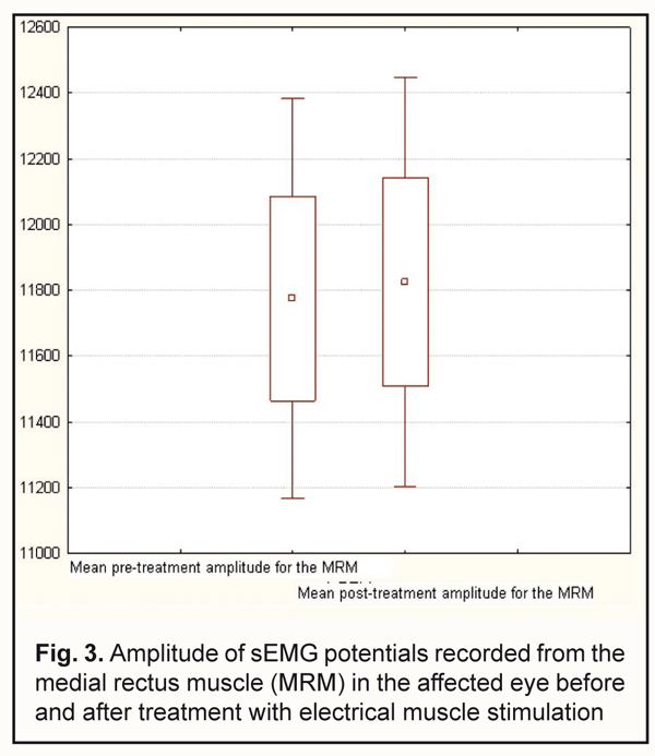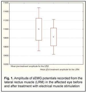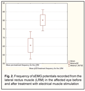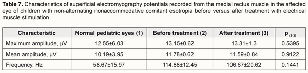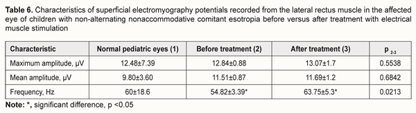 Pre-treatment and post-treatment changes in the electrical activity of the LRM of the strabismic eye in children with NNCES and presented in Table 6 and Figs. 1 and 2. The table shows that, after treatment, amplitudes of sEMG potentials from the LRM did not change (р > 0.05), but the frequencies statistically significantly increased (р < 0.05).