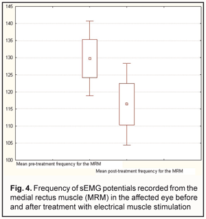 Pre-treatment and post-treatment changes in the electrical activity of the MRM of the strabismic eye in children with NNCEX are presented in Table 7 and Figs. 3 and 4. The table shows that amplitudes of sEMG potentials from the MRM did not change (р > 0.05), whereas the frequency decreased, alrhough not significantly (р >0.05), and became more normal after treatment.