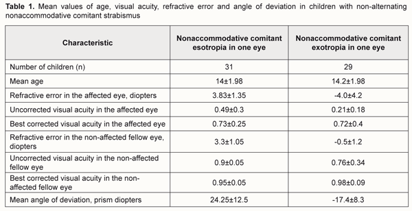 Introduction Strabismus occurs in 0.5-7.1% of children, often disturbs the development of normal visual acuity and binocular vision, and is a substantial cosmetic defect that affects the child’s social development. Alternating strabismus occurs much more often than non-alternating strabismus. In non-alternating nonaccommodative comitant strabismus (NNCS), the affected eye has profoundly reduced visual function compared to the non-affected fellow eye. This is why most ophthalmologists consider only orthoptic and pleoptic or surgical treatment as the first option, but do not consider physiotherapeutic methods at all when managing patients with NNCS. Low awareness of physiotherapeutic approaches for the treatment of strabismus among practitioners may be explained not only by unavailability of proper literature, but also by unavailability of techniques for testing the physiological state of the lateral and medial rectus muscles (LRMs and MRMs, respectively), especially in children, in a non-invasive way. Some features of the ocular neuromuscular system make the electric testing problematic, since the electric current required for determination of apparent deviation of the eye (either from its neutral position, or from the fixation object) significantly exceeds the pain threshold. Changes in the state of the ocular neuromuscular system have been judged also from a coordimetry examination that allows estimating the motor function of the strabismic extraocular muscles. However, the coordimetry method does not allow determining changes in the ocular neuromuscular system after a course of electric muscle stimulation. The purpose of the study was 1) to determine the characteristics of electric potentials of the horizontal extraocular muscles in NNCS, and 2) to determine the changes in the ocular neuromuscular system with the help of superficial electromyography (sEMG) before and after a course of electric stimulation of the muscles. Materials and Methods Thirty-one children (62 eyes) with non-alternating nonaccommodative comitant esotropia (NNCES) and 29 children (58 eyes) with non-alternating nonaccommodative comitant exotropia (NNCEX) underwent examination. The optic media and fundi were normal. Data from history taking and ocular examination were used to classify the type of strabismus. Table 1 shows mean characteristics of the study sample.