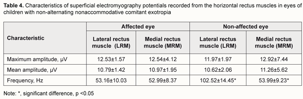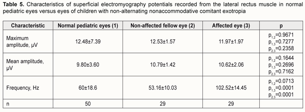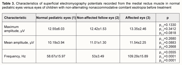Results and discussion The data on the functional state of the horizontal extraocular muscles in the examined children before treatment is presented in the tables below. There were no significant differences in the mean amplitude and maximum amplitude of sEMG potentials between the esotropic eye and fellow eye in children with NNCES (Tables 2 and 3). In addition, the frequency of sEMG potentials was significantly higher in the esotropic eye than in the non-affected fellow eye (109.29 ± 15.89 Hz vs 53±3.49 Hz, р=0.0001) and in normal pediatric eyes (58.67±15.97 Hz, р=0.0001).