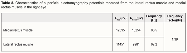 The characteristics of sEMG potentials recorded from the horizontal extraocular muscles in children with NNCEX are presented in Table 4. Mean amplitude and maximum amplitude of sEMG potentials of the LRM in the strabismic eye in these children were similar to those in the normal eyes of controls, with no significant differences (р > 0.05). In addition, frequency of sEMG potentials was significantly higher in the strabismic eye than in the fellow eye (102.52 ± 14.45 Hz vs 53.16±10.03 Hz, р=0.0001) and in normal pediatric eyes (60±18.6 Hz, р=0.0001).