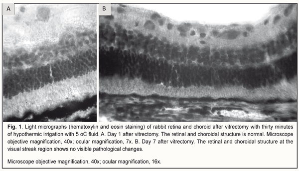 Introduction Therapeutic controlled hypothermia has been successfully applied in various medical fields (like cardiac surgery, neurosurgery, resuscitation science, and neonatology) for improving brain cell resistance to ischemic conditions [1-3]. The neuroprotective effect of hypothermia is based on reducing the induction of neuronal apoptosis through reduction in the rate of neuronal metabolism. Thus, a 1°С decrease in brain temperature leads to a 5% reduction in both neuronal oxygen consumption and glucose metabolism [4]. Irrigating solutions with a temperature well below that of intraocular media are used in common intraocular surgical procedures for a number of eye disorders. Usually, the temperature of the irrigating solution corresponds to that of the operating room environment and is not controlled during surgery [5]. Consequently, ophthalmological surgical procedures are performed under conditions of uncontrolled artificial local ocular hypothermia. Nevertheless, scant research has assessed the safety and efficacy of various temperature regimes in eye surgery [6-7]. It remains poorly understood what should be the temperature of the irrigating solution for intraocular surgery and how long it is reasonable to use irrigating solutions during intraocular surgery. Understanding the dynamics of structural changes in chorioretinal structures under conditions of hypothermia will enable (1) the development of a controlled ocular hypothermia technology, (2) more effective use of benefits of low temperatures in eye disease treatment, and (3) reductions in the rates of some intra- and post-operative complications. The purpose of the study was to investigate the structure of the rabbit chorioretinal complex after vitrectomy with the use of irrigating solutions having different temperatures for 30 minutes. Materials and Methods Twelve Chinchilla rabbits (24 eyes; weight, 2.5-3.5 kg) were included in this study and divided into two experimental groups and one control group. The two experimental groups, each of 5 rabbits (10 eyes), were subjected to vitrectomy with either 22°C or 5°C irrigating solution. The ambient operating room temperature was between 22 °С and 24 °С. Two intact rabbits (4 eyes) were used as controls for comparison. A 23-G three-port pars plana vitrectomy (PPV) was performed using the Alcon Accurus 400VS vitrectomy system (Alcon Laboratories, Fort Worth, TX). Technique The surgical site was prepared with antiseptic solution and epibulbar anesthetic was administered. Thereafter, a standard three-port core and peripheral vitrectomy was performed with cutting rates of 1500-1800 cuts/min, aspiration pressure of 150 mm Hg, and irrigation pressure of 20 mm Hg. The duration of irrigation/aspiration was 30 minutes. Balanced Ringer’s lactate was used as an intraocular irrigating solution. Cold (5 °С) fluid was prepared by cooling the solution inside the irrigating tube with gel packs that were located outside the tube, and thus cooling was performed in close proximity to the surgical site. Room-temperature (22 °C) fluid was obtained by placing the bottles with solution in the operating room for several hours before surgery. The temperature of the irrigating solution delivered into the eye was monitored and controlled during surgery. A thermoelectric device [8, 9] developed by the Institute of Thermoelectricity of the NAS of Ukraine and MES of Ukraine, and the Filatov Institute was used for measuring temperatures of various ocular structures, irrigating solution, and operating room. In addition, a smartphone attached infrared thermography system, FLIR ONE, (FLIR Systems, Wilsonville, OR) was used to monitor and control the temperature of the irrigating solution. After a lid speculum was placed, epibulbar anesthetic was administered, the three ports were created, and a temperature measuring probe was introduced into the vitreous cavity through a standard 23-G pars plana port. Temperatures in various parts of the vitreous cavity were measured before surgery and at different surgery time points. In addition, rectal temperature measurements were taken, and air temperature and relative humidity in the operating room were registered. All animal experiments were performed in compliance with the Law of Ukraine on Protection of Animals from Cruel Treatment No. 3447-IV dated 21.02.2006 and European Convention for the Protection of Vertebrate Animals Used for Experimental and Other Scientific Purposes from the European Treaty Series (Strasbourg, 1986), and approved by a local Bioethics Committee of the Filatov Institute. The animals were housed and bred conventionally. Each animal underwent biomicroscopy and ophthalmoscopy at baseline, immediately after surgery, and then daily until euthanasia. Prior to surgery, animals were anesthetized with thiopental sodium 10% (1.0 mL/kg, intramuscularly). Immediately thereafter, both eyes received a drop of proxymetacaine HCl (0.5%) for topical anesthesia. The pupils were dilated with atropine sulphate. After surgery, a drop of sulfacyl natrium 20% and a drop of Ofloxacin 0.3% were applied to each eye four times daily during the observation period of 1 to 7 days. Histology was performed at the Pathology and Electronic Microscopy Laboratory of the Filatov Institute. Three animals from each experimental group of five rabbits were euthanized on the first postoperative day, and the remaining two rabbits in each experimental group were euthanized on the seventh postoperative day. Immediately after euthanasia of each rabbit, eye globes were enucleated and fixed for 24-48 hours in 10% neutral formalin. Formalin fixation was followed by processing, embedding in paraffin, sectioning to 5 μm, mounting and hematoxylin and eosin staining in a routine manner. The chorioretinal complex was histologically examined by light microscopy. Statistical analysis The experimental temperature data was subjected to statistical analysis. Data is presented as mean ± sta