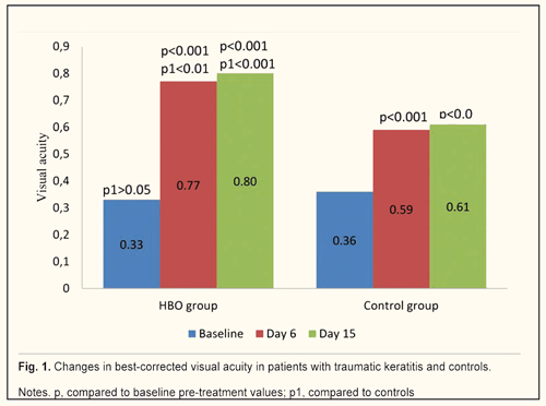 Direct linear correlations were observed between mean BCVA and objective symptom scores, specifically, inflammatory infiltration score (ґ=0.513, р < 0.05), inflammatory injection score (ґ=0.536, р<0.05), corneal edema score (ґ=0.573, р < 0.05), and corneal fluorescein staining score (ґ=0.593, р < 0.05) in patients of the HBO group. Therefore, our findings demonstrate the clear positive effect of adjunctive HBO on the corneal status in the patients. Conclusion First, by the end of treatment, mean BCVA increased 2.3-fold (p < 0.001) in the HBO group and 1.6-fold (p < 0.001) in the controls. At day 15, mean BCVA was 29.5% higher in the former than in the latter group (p < 0.001). Second, by the end of treatment, mean total scores decreased by 94.27% (to 0.57±0.03) in the former group and by 90.66% (to 0.94±0.04) in the latter group (between-group score percentage difference, 39.36%; p < 0.01). Third, the presence of correlations between improvements in visual acuity and the method of treatment for traumatic keratitis reflects the pathogenetic role of objective symptoms in the pathogenesis of this disease and underscores the need for HBO therapy. Finally, the findings presented support the idea that HBO can be used as a valuable adjunct to conventional therapy for management of traumatic keratitis. References 1.Gundorova RA, Stepanov AV, Kurbanova NF. [Current ophthalmic traumatology]. Moscow: Meditsina, 2007. Russian. 2.Chudniavtseva NA. [Restorative treatment of patients with eye traumas complicated by iridodialysis]. Oftalmol Zh. 2010;1:102-5. Russian. 3.Petrunia AM, Faruk IS. [Efficacy of lypophlavon in the comprehensive treatment for traumatic keratitis]. Oftalmol Zh. 2006;3:102-4. Russian. 4.Sakovich VN, Nikitchina TS, Shcherbakov BD. [Use of phlogenzym in the treatment for herpetic keratitis]. Oftalmologiya. Vostochnaya Evropa. 2012;2:141-5. Russian. 5.Gusova MK. [Toxic damage to the optic nerve secondary to alcohol intoxication]. [Abstract of Cand Sc (Med) Thesis]. Moscow: Russian Medical Postgraduate Education Academy; 2008. 15 pp. Russian. 6.Eliseeva EV. [Hyperbaric oxygenation in ophthalmology: Tutorial]. Karaganda; 2010. Russian. 7.Kuz’minov OD, Lukich VI. [Use of HBO in ophthalmology]. Bul. hiperbaricheskoi biologii I meditsiny. 2001;1-4:76-85. Russian 8.Znamenskaia MA, Rykov SA. [Herperic eye injuries]. In: Znamenskaia MA, editor. [TORCH infections in obstetrics and neonatal care]. Kyiv: Standart Digital Print; 2008. Russian. 9.Beda DI. [Age-related macular degeneration management including the use of hyperbaric oxygenation]. [Abstract of Cand Sc (Med) Thesis]. Krasnoyarsk: State Medical Academy; 2010. 118 pp. Russian 10.Verkman AS. Role of aquaporin water channels in eye function. Exp Eye Res. 2003 Feb;76(2):137-43. 11.Wilson SE, Mohan RR, Mohan RR, et al. The corneal wound healing response: cytokine-mediated interaction of the epithelium, stroma, and inflammatory cells. Prog Retin Eye Res. 2001;20:625-37.