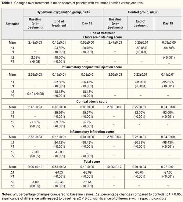 Introduction Ocular trauma and its consequences can result in loss in capacity for labor and are a major contributor to the incidence of disability among young individuals [1]. In Ukraine, the prevalence of ocular trauma was estimated to be 24.5 per 100,000 population and the incidence was found to be high in all the regions [2]. The rate of complications secondary to ocular trauma has been reported to be as high as 22.5% to 30% depending on the age group [2]. Complications (like keratitis, recurrent corneal erosion, corneal opacities and ulcers) secondary to ocular trauma are common despite the use of current treatment strategies [3]. Severe traumatic keratitis usually requires in-patient treatment [4]. Therefore, the treatment strategies for traumatic corneal injuries need further development. Significant changes in etiology of traumatic keratitis due to the wide and uncontrolled use of antibiotics and antibacterial agents for prevention and treatment of the disease, and issues related to drug bioavailability, targeted transport to the pathological site, toxicity and side effects, duration of drug action, stability of formulation under physiological conditions, and inflammation-associated tissue hypoxia necessitate the search for and development of new treatment methods [5, 6]. Hyperbaric oxygenation (HBO) has been reported to be promising for treating inflammations of various origins [8]. HBO therapy not only improves tissue microcirculation and alleviates the consequences of tissue hypoxia, but also positively effects anaerobic conjunctival flora, modulates the immune status, provides sedative effect, enhances tolerance to allergens, activates reparative processes in tissues, and enhances the effect of some medications (including re-epithelizing agents) which allows reducing the dose and duration of treatment. New findings on the methods used to treat keratitis will pave the way to optimized therapy and improved treatment outcomes [7]. The optimum choice of therapy should be based on the patient's clinical characteristics, with strict adherence to laboratory protocol observed to ensure accurate results of specific diagnostic tear fluid tests relevant to the disease. Therefore, the study topic is important because of high prevalence of traumatic keratitis and the need for enhancement of diagnosis and treatment methods. The study purpose was to improve clinical characteristics in traumatic keratitis patients undergoing adjunct oxygenation. Materials and Methods Sixty-nine patients (69 eyes; age, 18 years to 75 years; 70% men and 30% women) with traumatic keratitis were involved in this study. They were divided into the HBO group (33 patients) and the control group (36 patients). All patients received antibacterial therapy, mydriatics, antiallergic agents, tissue therapy, vitamins and Emoxypine. Patients of the HBO group were administered adjunctive HBO therapy over 40 minutes daily for 6 to 10 days. During each 40-minute session, the patient was treated inside the OKA-MT HBO chamber operating in the 1.2 ATA mode. A routine eye examination included visual acuity assessment, slit-lamp biomicroscopy of the anterior segment structures, and ophthalmoscopy. In addition, assessment of corneal re-epithelization through fluorescein staining was performed. Throughout the study, the clinical characteristics were scored. We examined changes in the scores over time in patients of both groups. The scale used for scoring inflammatory response consisted of five categories: inflammatory infiltration, inflammatory injection of the conjunctiva, corneal edema, inflammatory infiltration of the superficial cornea, and corneal fluorescein staining. Categories were scored as follows according to previous studies [3, 4, 8]: Corneal fluorescein staining (0, no local staining; 1, punctate corneal staining, < 1.0 mm in diameter; 2, < 3 mm in diameter; 3, > 3 mm in diameter); Inflammatory injection (0, pale pink conjunctiva, physiologically normal; 1, mild pericorneal injection; 2, moderate pericorneal injection; 3, marked pericorneal injection); Corneal edema (0, no corneal edema and the whole cornea is transparent; 1, local corneal epithelial edema at the inflammation site (mild corneal edema); 2, local epithelial edema with involvement of superficial stromal layers (moderate corneal edema); 3, local edema involving both superficial and deep stromal layers (marked corneal edema)); and Inflammatory infiltrates (0, no infiltration; 1, punctate infiltrates, < 1.0 mm in diameter; 2, < 3 mm in diameter; 3, > 3 mm in diameter). The scores at different time points were included in the medical records. Results The patients in the HBO group demonstrated a corneal fluorescein staining score that was practically similar to that of the controls at baseline (between-group score percentage difference, 2.02%; p > 0.05; Table 1), whereas their post-treatment corneal fluorescein staining scores were better than those of the controls (p < 0.001). Thus, after treatment, in the HBO group, corneal fluorescein staining score decreased by 93.80% (from 2.42±0.03 to 0.15±0.01) compared with a decrease of 89.88% (from 2.47±0.03 to 0.25±0.01) in the controls (p < 0.001), and was 40% lower than in the controls. By day 15 after treatment, re-epithelization was almost complete in both groups (p > 0.05). The mean time for complete resolution of fluorescein staining in the HBO group was 3.22±0.04 days versus 7.43±0.08 days in the controls (p < 0.001).