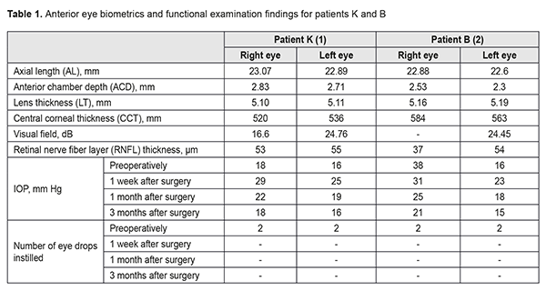 Background: Primary open angle glaucoma is a multifactorial optic neuropathy and associated with a number of factors such as age, ethnicity, family history, central corneal thickness, and intraocular pressure (IOP). In addition, it might be associated with myopia and certain systemic disorders. Family history is the highest risk factor as shown by the presence of glaucoma in first-degree relatives. Purpose: To assess the potential for the development of glaucoma due to genetically predisposed features of ocular anatomy and age-related changes in these features based on a case glaucoma in monozygotic siblings. Materials and Methods: We analyzed the clinical case of two monozygotic sisters with the disease based on complaints, history, physical and instrumental examination, treatment and outcomes. Results: The two monozygotic sisters (1) were diagnosed with the same disorder approximately at the same age, (2) presented with similar ocular biometric characteristics and age-related changes of the anterior eye, and (3) underwent the same surgery on both eyes, which resulted in improved visual functions, stable IOP reduction, stable perimetric visual fields, and stable OCT derived RNFL thickness. Conclusion: The results obtained in monozygotic siblings confirm that genetic susceptibility to changes in anterior eye parameters and age-related changes in anterior ocular structures along with environmental factors constitute the main cause of hydrodynamic impairment resulting in the development of glaucoma. Keywords: open angle glaucoma, anterior chamber depth, lens thickness, corneal thickness, pseudoexfoliation syndrome Introduction Glaucoma is the second most common global cause of blindness after cataract. It is projected that the number of people with glaucoma will increase to 79.7 million by 2020, and of these, 74% will have open angle glaucoma (OAG) [1]. In addition, bilateral blindness will be present in 5.9 million people with OAG and 5.3 million people with angle closure glaucoma (ACG). Epidemiological studies suggest that by 2040 the prevalence of primary open angle glaucoma (POAG) is estimated to increase to 111.8 million due to population aging [1-3]. Glaucoma comprises a group of heterogeneous progressive optic neuropathies characterized by morphological changes in the optic nerve and retinal nerve fiber layer (RNFL). These changes are associated with progressive damage of retinal ganglion cells and visual field loss. OAG comprises the majority of cases in the United States and Western Europe, of which, POAG is the most common type. The disease is multifactorial and associated with a number of factors such as age, ethnicity, gender, central corneal thickness, intraocular pressure (IOP), myopia, and genetic factors. In addition, it might be associated with systemic disorders [2, 4]. Genetic population studies have confirmed that family history is a major risk factor for glaucoma [5, 6]. The action of a large number of grouped or independently inherited genes along with environmental factors results in anatomical abnormalities of the anterior eye and development of glaucoma. Such abnormalities include adhesion of the iris to the anterior lens capsule due to lens thickening with advancing age. This leads to abnormal aqueous outflow between these structures, and increased pressure in the posterior chamber, resulting in elevated IOP and glaucoma. Assessment of anterior eye structures is an essential part of the examination of the eye. This assessment can be performed with a number of modalities such as A-scan ultrasound biometry, ultrasound biomicroscopy (UBM) and gonioscopy. In addition, novel anterior eye imaging techniques like anterior segment optical coherence tomography (ASOCT) provide both for quantitative assessment and good visualization. It has been demonstrated that the higher preoperative IOP and the more marked the changes in the anterior chamber of the eye (the shallower the anterior chamber), the more marked the postoperative IOP changes [7-10]. Ocular biometric characteristics are known to vary with ethnicity [11]. Knowledge of normal changes in ocular anatomy can aid in our understanding of the pathogenesis, diagnosis and management of glaucoma. Previous epidemiological studies have demonstrated important relationships between ocular biometric characteristics and the ocular disorder. Alaskan Eskimos, who were shown to have a markedly shallower anterior chamber than Chinese, Blacks and Whites, are particularly prone to glaucoma. Long axial length in Asian peoples has been consistently associated with a high prevalence of myopia in Asian populations [12]. Findings of these and numerous other studies might implicate that there is a relationship between the prevalence of glaucoma and ocular biometric characteristics. Glaucoma is thought to be very rare in Māori and Pacific people of New Zealand, and the deeper anterior chamber identified in the study by Yoon et al [12] may have a protective role against the development of glaucoma. In a recent epidemiological study carried out in Norfolk Island, a small Pacific island situated between New Zealand and Australia, ocular biometric parameters were compared between Norfolk Island Pitcairn Pedigree (those who could trace their family history to the indigenous Polynesian island inhabitants) and non‐Pitcairn Pedigree who were mostly composed of Caucasians. This study did not find any significant difference in biometric parameters between the two populations, except for intraocular pressure and mean keratometry value. Genetic analysis has shown that people belonging to the Norfolk Island Pitcairn Pedigree were genetically 88% European and 12% Polynesian [12]. Numerous studies have confirmed relationships between preoperative characteristics (anterior chamber depth and IOP) and changes in IOP after cataract-only surgery or combination glaucoma-plus-cataract surgery [7-10]. Genetic susceptibility is due to multiple genes, and less th