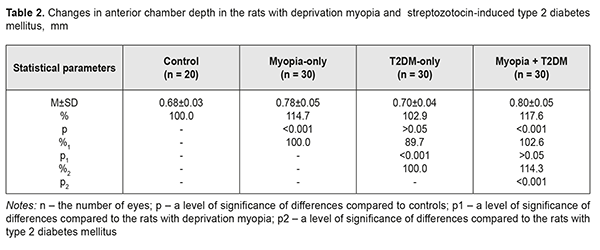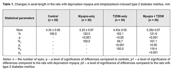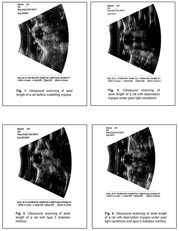 Background. Recently, a protective effect of high myopia on the retina in diabetes has been reported; however, the mechanism of the interrelation between the elongation of axial length and the severity of diabetic complications in the retina is unclear. Purpose. To compare retinal changes in experimental type 2 diabetes melitus (T2DM) in animals with and without myopia as well as to determine the correlation betweeen axial length and anterior chamber depth of the eye and the severity of retinal disorders in DM. Material and Methods. Eyelids of two-week animals (30 rats) were sutured to induce axial myopia [12]. The animals were kept under poor light conditions for 14 days in order to achieve a higher rate of myopia [11, 13]. After a fortnight, the sutures were removed. After another fortnight, 15 rats with experimental myopia and 15 intact rats were modelled T2DM. T2DM was induced using 5 daily intraperitoneal injections of streptozotocin (15.0 mg per 1 kg). Control group comprised 10 intact rats which were kept under natural light condition for 14 days. All the animals were performed ultrasound scanning of the anterior segment to determine axial length (AL) and anterior chamber depth (ACL). A criterion of a diabetes onset was a blood glucose level of 4.5 mmol/l and above. The state of the retina was assessed ophthalmoscopically and expressed using a four-point scoring system. After two months, the animals were sacrificed under general anesthesia and the eyeballs were enucleated. Axial length was measured post mortem using a digital sliding caliper (Topex). Data obtained were processed using the non-parametric tests. Results. In experimental axial myopia, axial length increased by 20.5% compared with control. Experimental type 2 diabetes mellitus did not influence significantly on the axial length of the animals. In the rats with type 2 diabetes and deprivation myopia, axial length was significantly increased by 21.9% and by 19.4% as compared with control and the diabetic-only rats, respectively. Anterior chamber depth in the rats with type 2 diabetes mellitus and deprivation myopia was also increased compared with control. In experimental streptozotocin-induced type 2 diabetes mellitus, the diabetic rats with deprivation myopia had more pronounced changes in the retinal vessels as compared with the non-diabetic rats with deprivation myopia. A negative correlation was revealed between axial length values and the state of the retina in the diabetic rats with deprivation myopia (RSpearman = - 0.68, р<0.05); in a part of the animals, with an increase in axial length, the severity of the pathologic changes in the retina was less pronounced. Conclusion. In our experiment, the myopisation of the eyeball, including the elongation of axial length and the deepening of anterior chamber depth, is accompanied by a decrease of the signs of vascular disorders in the retina which are common for DM. This is also evidenced by the presence of a negative correlation between the myopisation of the eyeball and diabetes-associated disorders in the ocular fundus of the rats. Keywords: deprivation myopia, type 2 diabetes mellitus, retina, ultrasound testing, rats, experiment Background Diabetic retinopathy (DRP) is one of the major causes of vision impairment. Despite the numerous researches worldwide on pathogenesis and treatments for this severe condition, there are still a lot of questions which remain open. In particular, studying the characteristics of a course of different pathological conditions in a single organ is a little-studied and relevant issue. A combination of pathological processes in eye tissues has an effect on pathogenetic mechanisms, especially in cases when pathological processes occur in the same tissue structures and, as a rule, aggravate the course of disease [1]. However, clinical observations have shown a different picture when myopia is combined with diabetes mellitus (DM). In myopia, especially high myopia, the frequency of non-proliferative and proliferative DRP and progression of these diabetic changes in the retina are decreased [2-5]. Meta-analysis of population-based crossover designs has shown that myopia reduces the risk of development of diabetic complications in the retina as compared to emmetropic eyes. Each millimeter increase in axial length in diabetic patients is associated with the decreased incidence of initial and advanced DRP, 0.86 and 0.80 times, respectively. A one diopter increase in refraction and an 11 mm increase in anterior chamber depth are associated with the decreased risk for DR development, 0.9 and 0.32 times, respectively [3]. The correlation between a course of DRP and axial length (AL) of the eyeball has been shown in a clinical study of 104 patients with DM [6]. DRP was approved to progress to a proliferative stage more frequently in patients with AL less than 23.0 mm. AL greater than 24.2 mm provides the rarer and later DRP development. Moss SE et al. have reported that myopia with a refractive error of even -2 diopters can thwart progression of diabetic retinopathy [7]. The presence of myopia was shown to be protective for progression to PDR (non-proliferative to proliferative stages) in younger-onset persons with an odds ratio of 0.40 (95% confidence interval, 0.18–0.86). Based on incidence assessment, it has been concluded that DRP makes up 40.9, 35%, and 70.4 in myopia, emmetropia, and hyperopia, respectively [8]. The authors have reported that no proliferative process is observed in moderate myopia and no DR sings are noted in high myopia. At the same time, Balashevich LI and Izmailova AS have stated that despite the fact of a possible protective effect of a myopic process on a risk for the development and the severity of DRP, proliferative DRP can be developed in patients with extremely high myopia and there are cases when diabetic edema develops in diabetes and myopia with a refractive error of over -20D [1]. In spite of clinical observat