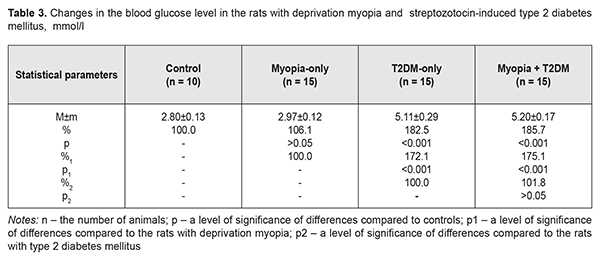 T2DM was induced using a fivefold intraperitoneal injection of subdiabetic doses of streptozotocin (15.0 mg per 1 kg). The occurrence of diabetes was confirmed by elevated blood glucose levels at Day 7 after the streptozotocin injections had been completed. Comparison of the initial blood glucose level in the rats revealed no significant difference between the groups. So, the blood glucose level at baseline (before the experiment started) and at the end of the experiment was, respectively, (2.95±0.24) mmol/l and (2.80±0.13) mmol/l (р>0.05) for the control group; and, respectively, (2.87±0.18) mmol/l and (2.97±0.12) mmol/l (р>0.05) for the group with experimental myopia. Intermittent administration of small doses of streptozotocin, a diabetes inductor, resulted in moderate hyperglycemia in the rats (Table 3). In the rats with streptozotocin-induced diabetes, the blood glucose level increased by 67.5% (р<0.01) and was equal to (5.11±0.29) mmol/l vs. (3.05±0.19) mmol/l at baseline. In the myopic rats with streptozotocin-induced diabetes, the blood glucose level increased from (2.99±0.19) mmol/l to (5.20±0.17) mmol/l, i.e. by 73.9% (р<0.001).