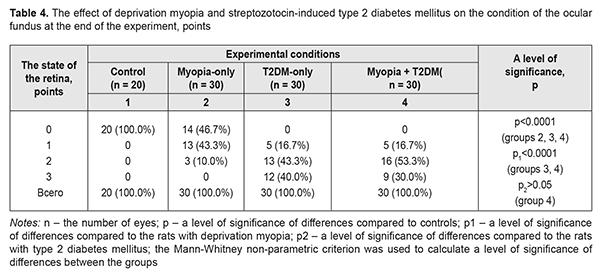 It should be noted that the blood glucose level was significantly increased in the streptozotocin-induced diabetic rats both with and without myopia: by 82.5 and 85.7%, respectively, as compared to controls (р<0.001); and by 72.1 and 75.1%, respectively, as compared to the myopic rats (р<0.001) (Table 3). During the experiment and especially at one month and a half after diabetes induction, the ocular fundus was examined both in the diabetic and non-diabetic rats (Table 4). The retinal vessels in the intact rats (controls) were within the norm throughout the experiment in 100%. Modelling deprivation myopia in the animals led to development of vascular disorders in the retina. In the myopic-only rats: moderate changes in the retina with slightly dilated veins and constricted arteries were noted in 13 eyes (43.3%); more pronounced retinal changes with dilated veins and more constricted arteries were in 3 eyes (10.0%). It should be noted, that retinal vessels were within norm in 14 eyes (46.7%).