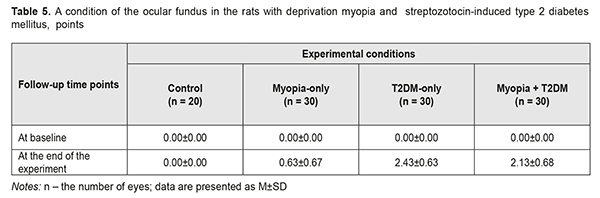 In the rats with streptozotocin-induced T2DM, the vascular changes in the retina were more pronounced than those in the rats with deprivation myopia (р1<0.0001): moderate retinal changes with slightly dilated veins and constricted veins in 5 eyes (16.7%); pronounced retinal changes with dilated veins and more constricted arteries in 13 eyes (43.3%); and pronounced retinal changes with dilated veins and constricted arteries and hemorrhage. In this group of the animal, there were no eyes without any vascular changes in the retina. A clinical picture of the ocular fundus in the T2DM rats with myopia tended to be changed (р>0.05) comparing to the retina in the T2DM-only rats (р>0.05). Thus, in the T2DM+myopia group we noted: moderate retinal changes with slightly dilated veins and constricted veins in 5 eyes (16.7%); pronounced retinal changes with dilated veins and more constricted arteries in 16 eyes (53.3%); and severe retinal changes with dilated veins and constricted arteries and sites of hemorrhage. These findings differed significantly from those obtained in the control group and the myopia-only and T2DM-only groups. The ocular fundus of the experimental animals was also assessed ophthalmoscopically using a 0-to-3-score system (Table 5). As we had already mentioned, no changes were revealed in the retina of the intact rats, serving as control, throughout the experiment; the retinal vessels and blood flow were within norm, scoring 0 points.