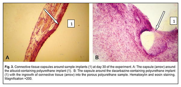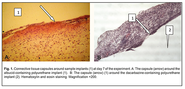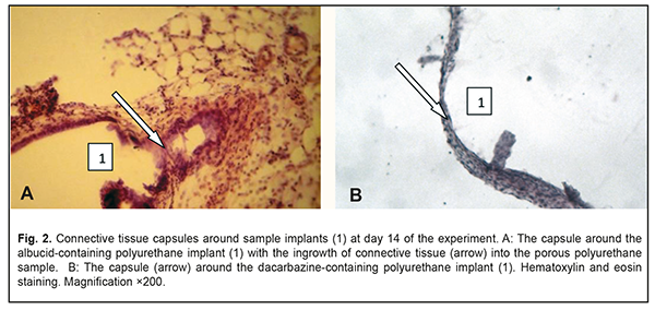Results: The development of the connective tissue capsule around the sample implant, with the capsule completely separating the implant from the surrounding host tissue, was observed at the early time points. Sample implant porosity contributed to cell migration and gradual ingrowth of tissue structures into the implants, which prevented fast implant resorption, and was indicative of the implant biocompatibility with the host tissues. The placement of albucid-containing polyurethane implants in experimental animals resulted in the surrounding host tissue responses typical of aseptic inflammation. The placement of the dacarbazine-containing polyurethane implant in the back of each animal resulted in apparent changes in surrounding host tissue typical for the inflammatory process. It is likely that dacarbazine from the dacarbazine-containing polyurethane sample implant was durably released in the host tissues surrounding the sample, and exerted some biologically active effect which resulted in persistent inflammation at the site of implantation.