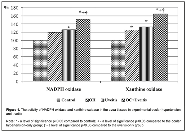 Introduction Primary open angle glaucoma (POAG) is a polyetiologic disease with a threshold effect and which is associated with many risk factors, including intraocular pressure rates, age, hereditary background, diabetes mellitus, etc.. Primary open angle glaucoma development is caused by metabolic and microstructural changes at the cellular level as a consequence of disorders in involutive and biomechanical processes, insufficient vascular autoregulation and insufficient blood flow, increased nerve cell apoptosis, and decreased natural neuroprotection. The disease is also associated with elastotic characteristics of the sclera, vascular dysregulation, age, changes in immune factors, ethnicity, atherosclerosis, and others [1, 2, 3, 4, 5]. Nowadays, studies on immune mechanisms of primary open angle glaucoma have revealed significant cellular and humoral dysimmunity. In the pathogenesis of primary open angle glaucoma, there can be an autoimmune inflammation followed by the destruction of ocular tissues. Antibodies to tissues of the vascular tract, retina, and optic nerve and proinflammatory cytokines have been found in the blood serum and tears of POAG patients. These factors can cause the development of uveitis in POAG [6, 7]. All physiological and pathogenic processes in the body have been proved to be associated, directly or indirectly, with the structure and function of biological cell membranes. These structures are considerably characterized by free radical chain reactions as physiological processes. However, an increased rate of free radical chain reactions is pathology and contributes to the development of various diseases in the body [8, 9, 10, 11, 12]. A pathologically activated free-radical reaction, particularly lipid peroxidation, is known to have a pathogenetic role in the glaucoma development. First of all, free-radical mechanisms are involved in the formation of ocular hydrodynamic disorders and increased intraocular pressure which is one of the major glaucoma symptoms. Pathological changes, associated with activated oxygen and oxygen metabolites, lead to destructive processes in the drainage system of the eye. It is assumed that the aqueous humour outflow can be reduced due to the increased content of “abnormal metabolites” in the humour and their toxic effect. Among those metabolites, in particular, are products of lipid peroxidation. Activation of free radical processes leads to disorders in aqueous humour outflow and damage to the structure and function of the trabecular meshwork, in particular [8, 9, 11, 13, 14]. The role of metabolic changes in the anterior eye tissues in the pathogenesis of uveal inflammation in patients with elevated intraocular pressure has been studied poorly. Of particular interest, in this respect, are free radical mechanisms, which can be a trigger of oxidant stress and cause damage to cell membranes in ocular tissues [14, 15, 16]. In view of this, studies on the pathogenetic role of peroxidation, oxidation and the state of pro-oxidant enzyme system in anterior eye tissues in glaucoma-complicated non-infectious inflammation of the uvea are currently important. The purpose of the present paper was to study the activity of pro-oxidant enzymes and levels of lipid peroxidation products in the uvea tissues in the rabbits with experimental anterior non-infectious uveitis against the background of ocular hypertension. Material and Methods The experiment was conducted on Chinchilla rabbits, weighed approximately 3 kg. The animals were kept under standard vivarium conditions and received food and water ad libitum. The experiment followed the General Ethical Principles of Animal Experiments (Third National Congress on Bioethics, Ukraine, Kyiv, 2007) and European Convention for the Protection of Vertebrate Animals used for Experimental and other Scientific Purposes (Strasbourg, 1986). The experiment involved forty-one animals which were divided into 4 study groups. Group 1: 10 animals with experimental ocular hypertension; group 2: 10 animals with experimental allergic uveitis; group 3: 12 animals with ocular hypertension and allergic uveitis; and group 4: 9 intact animals serving as controls. To simulate ocular hypertension in the animals of groups 1 and 3, the animals were made a single 0.1 ml injection of 0.3% carbomer in the anterior chamber [17]. To simulate allergic uveitis, the animals underwent general anaesthesia through 50 mg/kg ketamine administration, following local eye drop instillations of 0.5% procaine hydrochloride. Allergic uveitis was modelled using our method through the administration of bull serum albumin with a dose of 5 mg in previously sensibilized animals (Patent Application No u 201900513, Ukraine. A method of the modelling of non-infectious uveitis against ocular hypertension / I.M. Mikheitseva, S.G. Kolomiichuk, N.V. Bondarenko, T.I. Siroshtanenko). Intraocular pressure (IOP) was measured by a contact Maklakov tonometer using a 7.5 g plunger under local anaesthesia (0.5% proxymetacaine hydrochloride). IOP levels were (13.5±0.6) mmHg in controls; (18.7±1.2) mmHg in the ocular hypertension-only group; (15.3±1.4) mmHg in the anterior uveitis-only group; and (23.4±1.3) mmHg in the ocular hypertension and anterior uveitis group. Biological material for biochemical studies of aqueous humour and uvea tissues was collected 4 weeks after the modelling of ocular hypertension and anterior uveitis. The animals were taken out of the experiment under deep anaesthesia (10% thiopental sodium, 1ml/1kg) by air embolism. The eyes were enucleated on the ice at the temperature of 0ºС-5ºС. The tissues of the uvea and the aqueous humour were studied biochemically; the iris and the ciliary body were used to prepare homogenate using 0.9% sodium chloride with the ratio of 1:9 (weight: volume). The obtained extracts were centrifuged at 5 ºС for 10 minutes with 1000 r.p.m. We estimated the activity of pro-oxidant enzymes: NADPH oxidase [1