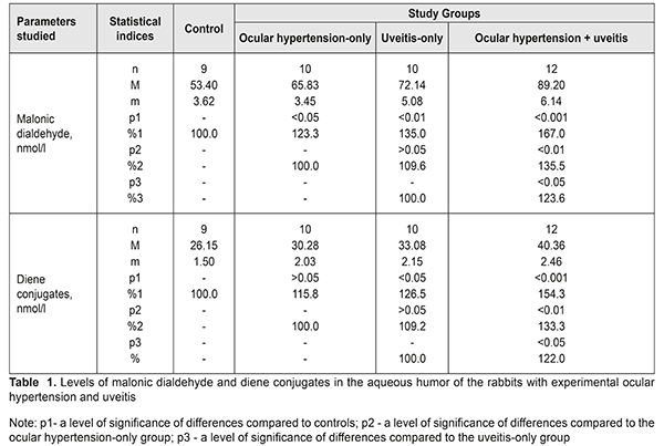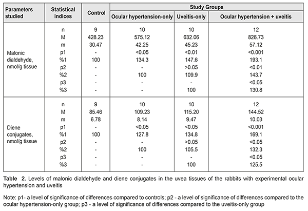 The level of malonic dialdehyde in the aqueous humour was increased by 23.3% (р<0.05), 35,0% (р<0,01), and 67.0% (р<0.001) in the ocular hypertension-only, uveitis-only, and ocular hypertension and uveitis groups, as compared to controls. Comparing the data between study groups showed that malonic dialdehyde in the ocular hypertension and uveitis group was increased by 35.5% (р<0.01) and 23.6% (р<0.05) compared with the ocular hypertension-only and uveitis-only groups, respectively. The level of diene conjugates in the aqueous humour tended to increase in the ocular hypertension-only group and differed insignificantly from the controls, by 15.8% (р>0.05). The diene conjugates level in the uveitis-only group was increased by 26.5% (р<0.05) as compared with controls. The level of diene conjugates in the ocular hypertension and uveitis group was significantly increased by 54.3% (р<0.001) compared with controls and by 33.3% (р<0.05) and 22.0% (р<0.05) compared with the ocular hypertension-only and uveitis-only groups, respectively. Table 2 demonstrates data on levels of malonic dialdehyde and diene conjugates in the uvea tissues of the rabbits with ocular hypertension and uveitis. The levels of malonic dialdehyde were increased by 34.3% (р<0.05) and 47.6% (р<0.01) in the ocular hypertension-only and uveitis-only groups, respectively, compared with controls. Maximal changes in the malonic dialdehyde level were noted in the animals with both ocular hypertension and uveitis. Here, the malonic dialdehyde level increased by 93.1% (р<0.001), 43.7% (р<0.01), and 30.8% (р<0.05) compared with controls, the ocular hypertension-only group, and the uveitis-only group, respectively. Studies on diene conjugates in the uvea of the rabbits showed the increased levels of diene conjugates as compared with controls: by 27.8% (р<0.05) in the ocular hypertension-only group; by 34.8% (р<0.05) in the uveitis-only group; and by 69.1% (р<0.001) in the ocular hypertension and uveitis group. The level of diene conjugates in the ocular hypertension and uveitis group was higher by 32.3% (р<0.05) and 25.5% (р<0.05) as compared with the ocular hypertension-only and uveitis-only groups, respectively. Evaluating the levels of lipid peroxides, it should be noted that the level of end products of lipid oxidation (malonic dialdehyde) was higher than that of intermediate products (diene conjugates) in all study groups, which can be caused by rates of lipid peroxidation of primary lipid peroxides in the given conditions. In addition, the most significant changes in the studied parameters, both in the aqueous humour and the uvea, were in the animals with uveitis against the background of elevated IOP. We believe that this confirms the fact that elevated IOP in a model of uveitis contributes to a significant rise of the pathogenic effect of these metabolites on the anterior eye tissues. The higher level of malonic dialdehyde and diene conjugates in the uvea tissues of rabbits can also be due to the diffusion of lipid peroxidation products from the aqueous humour. This possibility is not excluded since the major aqueous humour outflow occurs through the anterior pathways (in particular, through the trabecular (85%) and uveoscleral (5-15%) pathways, and, partially, through the iris) as well as through the posterior pathways (through the vitreous body in the perineural spaces of the optic nerve and perivascular spaces of the retinal vascular system) [23, 13]. Since the aqueous humor is produced by the ciliary processes in the posterior chamber and, afterwards, flows to the anterior chamber [3, 1], the excess of peroxidation products can get into the aqueous humor from ciliary body, iris, and other tissues due to various pathogenic factors (ocular hypertension, inflammation, etc.). Thus, our findings reveal an important link in the pathogenic action of elevated IOP which burdens inflammation in the uveal tissues through the activation of oxidative and peroxidative processes. In addition, our findings support the assumption that primary high-pressure glaucoma can be a factor worsening inflammation in the anterior eye. References 1.Erichev VP, Tumanov VP, Panyushkina LA. [Glaucoma and neurodegenerative disease]. Glaukoma. 2012;1:62–68. In Russian. 2.Zavgorodniaia NG, Pasechnikova NV. [Primary glaucoma: A new look at an old problem]. Zaporizhzhia: Orbita-YUG; 2010. 192 p. In Russian. 3.Nesterov AP. [Glaucoma]. M.: MIA; 2008. 360p. In Russian. 4.Pasyechnikova NV, Rykov SA, Naumenko LIu, Kryzhanovskaia TV. [Prevention of Blindness and Visual Impairment in Ukraine (implementation of the WHO’s Vision 2002 program)]. In: [Proceedings of the Conference on Current Issues of Ophthalmology]. 2009, Dnipropetrovsk: 8-11. In Russian. 5.Flammer J, Orgul S, Costa VP. The impact of ocular blood flow in glaucoma. Ibid. 2002; 21: 359–393. 6.Likhvantseva VG, Gabibov AA, Solomatina MV, Belogurov AA, Korosteleva EV, Vygodin VA. [The role of immune reactions in the pathogenesis of optic neuropathy in normal tension glaucoma]. Natsionalnyi Zhurnal Glaukoma. 2014;13(2):17-28. In Russian. 7.Sokolov VA, Mkhinini N, Levanova ON. [Autoimmune mechanisms in the pathogenesis of the primary open angle glaucoma]. Rossiiskii meditsinsko-biologicheskii vestnik. 2011;2:154-9. In Russian. 8.Beishenova GA, Chesnokova NB. [A role of free radical oxidation in the pathogenesis of uveitis]. Rossiiskii oftalmologicheskii zhurnal. 2015;9(2):99-105. In Russian. 9.Gazizova IR. [The state of the oxidation-reduction system in patients with primary open angle glaucoma]. Kazanskii meditsinskii zhurnal. 2012;3:488-90. In Russian. 10.Kurysheva NI. [Contribution of free-radical reactions of chamber humor to the development of primary open-angle glaucoma]. Vestn Oftalmol. 1996 Sep-Oct;112(4):3-5. In Russian. 11. Mikheitseva IN. [Lipid peroxidation in experimental adrenaline-induced glaucoma]. Oftalmol Zh. 1989;(7):427-8. In Russian. 12. Dinh QN, Drummond GR, Sobey