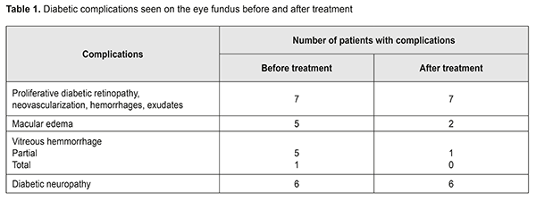 Introduction Diabetes mellitus (DM) and diabetic complications are one of the major medical and social problems today both in the developing and developed countries. According to World Health Organization, nowadays, the amount of diabetic patients has exceeded 1,000 million people, equaling 3% of the Earth population. The DM incidence increases by 5-7% every year and twice every 12-15 years. In Ukraine, this index equals 1 million people; however, the true DM rate is twice higher as it has been registered due to occurrence of a latent form of diabetes. Unsuspected diabetes mellitus is a disease in a latent form without acute symptomatology and with normal ranges of glycated hemoglobin and fasting plasma glucose [1, 2, 3, 4]. This pathology is more often diagnosed too late when the alterations in the body are irreversible [4, 5]. The danger of a latent disease lies in the fact that latent DM has no manifestations while the changes in the body are in process already. In unsuspected DM, the whole vascular system is damaged and there is an increased risk of a stroke and a heart attack [6, 1, 3]. The possibility of mortality due to a stroke and a heart attack is several times increased in people with unsuspected DM. Visual loss and neuropathy are also observed. Diabetic retinopathy (DRP) is one of the leading causes of vision-related disability among working age persons [7, 3]. Material and Methods Seven patients, 4 women and 3 men, aged 50-65 and 55-70, respectively, underwent the treatment at Department for Inflammatory Eye Diseases in the Filatov Institute of Eye Diseases and Tissue Therapy. The patients complained of both distance and near visual loss. All patients were performed the standard ophthalmological examination including visual acuity testing, intraocular pressure measurement, peripheral perimetry, and phosphene testing. Additionally, optic coherent tomography (OCT) and fluorescein angiography (FAG) of the retina were made. Results Ophthalmological examination showed visual acuity decreased in both eyes in all patients; in three patients, visual acuity was lower than 0.1. Fundus biomicroscopy and ophthalmoscopy showed that almost all patients had vitreous hemorrhage: partial vitreous hemorrhage in both eyes was in three patients; partial vitreous hemorrhage in one eye was in two patients; and one patient had total vitreous hemorrhage in one eye. Upon fundus examination, the patients were diagnosed proliferative DRP with neovascularization, hemorrhage, and exudates [6, 7]. Five of seven patients had macular edema in both eyes. Six of seven patients were diagnosed diabetic neuropathy (Table 1). At the same time, blood tests were within normal ranges and did not exceed 5.8 mmol/l. All patients complained of significant weight loss for last six months as well as of impaired extremity sensation; six of them had problems with teeth and gums.