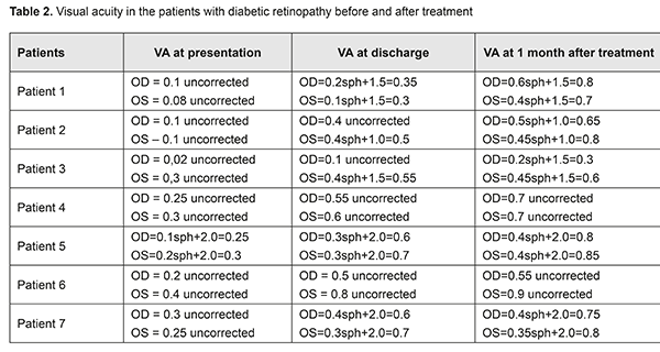 A clinical picture of the fundus corresponded to DRP, which was confirmed by the findings of FAG and OCT of the retina, peripheral perimetry, and phosphene tests. In this regard, the patients were referred to an endocrinologist. Endocrine examination included glycated hemoglobin and C-Peptide testing, exercise ECG testing, which made it possible to reveal a latent form of diabetes mellitus. After DM was confirmed, all patients were prescribed antihyperglycemic drugs and treated for DRP, conservatively and surgically. Conservative treatment included vasodilating, antioxidant, and nootropic drugs. Against the background of conservative treatment, the patients underwent panretinal laser retinal photocoagulation [8]. To resolve vitreous hemorrhage, an intravitreal injection of prourokinase was made. Five patients were performed intravitreal anti-VEGF injections. Changes in best corrected visual acuity (BCVA) after treatment are demonstrated in Table 2. Thus, BVCA increased after treatment in all patients. In the patient with the minimal BVCA value, BVCA increased from 0.02 at presentation to 0.1 at discharge and to 0.3 at 1 month after treatment. The patients with pre-treatment BVCA of 0.1-0.3, BVCA increased to 0.5-0.7 at discharge and to 0.6-08.8 at 1 month after treatment. Macular edema remained in two patients; partial vitreous hemorrhage was observed only in one patient.
