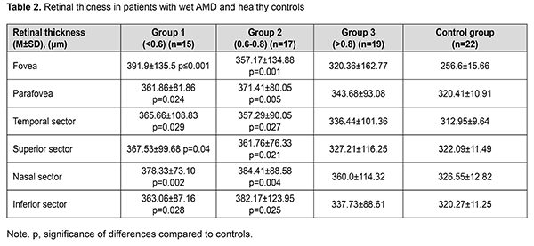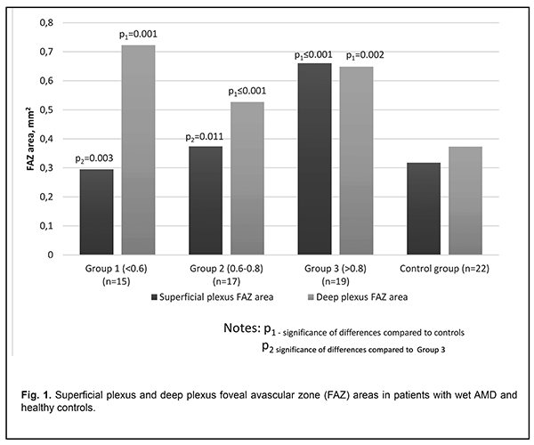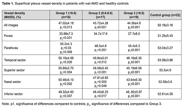 Retinal thickness was significantly (р<0.05) increased in Groups 1 and 2 in all thickness measurement zones compared to controls, but there was no significant difference (р>0.05) in retinal thickness for any thickness measurement zone in Group 3 compared to controls. In Groups 1, 2 and 3, total foveal thickness was 52.7%, 39.2%, and 24.8%, respectively, increased, and total parafoveal thickness was 12.9%, 15.9%, and 7.3%, respectively, increased, compared to controls. It can be concluded from the above that patients in Group 1 exhibited mostly apparent signs of retinal edema and minimal alterations in the retinal microvascular bed. Patients in Group 2 had greater retinal thickness, but moderately lower plexus vessel density compared to controls. Patients in Group 3, as opposed to those in Groups 1 and 2, had substantially lower superficial plexus vessel density and insubstantially altered retinal thickness compared to controls, which should be taken in account when selecting the treatment strategy for these patients. Discussion FA has been traditionally considered the gold standard for diagnosing vascular changes in AMD [1, 2]. FA, but not OCTA, uses dye to assess the permeability of walls of normal or newly formed vessels. However, with the help of OCTA, vascular abnormalities can be identified using an approach based on the assessment of vessel depth and imaging the vessels above or below the RPE. OCTA images are not obscured by leakage from damaged vessels, enabling a more accurate assessment of the borders and area of capillary obstruction and neovascular network. OCT angiograms are co-registered with OCT B scans that are obtained concurrently, which enables visualization of subretinal fluid accumulation at the neovascular membrane, allowing for obtaining the information that is similar to the information on leakage in retinal FA. Another benefit of OCTA is that it enables a separate assessment of abnormalities of different retinal and choroidal plexuses [19]. In addition, OCTA allows for quantitative assessment of retinal blood flow, and measurements of the vessel density using OCTA showed relatively good repeatability for various retinal diseases [20]. Therefore, OCTA is a dyeless technique that enables accurate software-based assessment and quantification of FAZ area and retinal microvascular bed structure at various levels. The FAZ is an anatomic area of a special interest for clinicians since changes in the metrics related to this area may mirror the onset and progression of retinal disease. It has been reported [10, 21] that, in normal eyes, the superficial plexus FAZ area varied from 0.25 to 0.34 mm2, whereas the deep plexus FAZ area varied from 0.37 to 0.48 mm2, which is in line with our findings for healthy controls. FAZ area and vessel density have been investigated in various pathological conditions. Thus, increased OCTA measures of FAZ area and decreased OCTA measures of retinal vascular plexus density may reflect retinal pathologies such as diabetic retinopathy or retinal vessel occlusion 13, 14, 22, 23]. In a study by Stavrev et al [24], patients with different stages of dry AMD demonstrated no significant changes in FAZ area compared to healthy controls. To the best of our knowledge, there have been no studies on the changes in FAZ area and retinal microvascular bed structure in exudative AMD. The results of the current study evidence an increased deep plexus FAZ area in all patients with wet AMD irrespective of changes in the retinal microvascular bed and retinal thickness. In addition, there was a group of patients with a normal superficial plexus FAZ area, marked retinal edema and no decreased plexus density, and a group with an increased superficial plexus FAZ area, decreased microvascular bed capacity and insubstantial retinal edema. There have been reports on negative correlation between superficial plexus FAZ area and central retinal thickness in normal eyes [10, 20], which was also observed in the control group of the current study (r = -0.62; р<0.05). However, no statistically significant correlation was found between FAZ area and retinal thickness in patients with exudative AMD. Conclusion First, OCTA is a contactless and non-invasive technique for examination of retinal microvascular bed structure which enables us to perform quantitative measurements related to the retinal vascular plexus (retinal plexus density and FAZ area). Second, deep plexus FAZ area was 1.5 to1.9 times increased compared to controls (р<0.01) in all groups of patients with exudative AMD. Third, superficial plexus parafoveal vessel density in Group 3 of exudative AMD patients (45.4±5.3%) was statistically significantly lower than in Group 1 (50.2±4.3%) and controls (53.04±3.27%). Finally, retinal morphological changes in eyes with exudative AMD do not reflect changes in the vascular bed of retinal plexuses. In eyes with the ratio of superficial plexus FAZ area to deep plexus FAZ area (SPFA/DPFA) < 0.6, retinal thickness was increased, and there were no substantial changes in vessel density compared to controls. In eyes with the ratio > 0.8, there was no significant change in parafoveal thickness (343.68±93.08 μm), but vessel density was decreased compared to controls. References 1.Wong WL, Su X, Li X, Cheung CM, Klein R, Cheng CY, Wong TY. Global prevalence of age-related macular degeneration and disease burden projection for 2020 and 2040: a systematic review and meta-analysis. Lancet Global Health. 2014 Feb;2(2):e106-16. 2.Sulzbacher F, Kiss C, Munk M, Deak G, Sacu S, Schmidt-Erfurth U. Diagnostic evaluation of type 2 (classic) choroidal neovascularization: optical coherence tomography, indocyanine green angiography, an fluorescein angiography. Am J Ophthalmol. 2011 Nov;152(5):799-806.e1. 3.Lumbroso B, Huang D, Jia Y, Fujimoto JG, Rispoli M. Clinical guide to Angio-OCT: non invasive, dyeless OCT angiography. 1st ed. New Delhi: Jaypee Brothers Medical Publisher (P) Ltd; 2015. 4