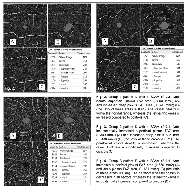 No significant difference (р>0.05) in foveal vessel density was seen between any group of patients and controls. The mean parafoveal vessel density in groups 1, 2 and 3 was 50.2±4.3%, 48.5±4.8%, and 45.4±5.3%, respectively, which was 5.4% (р<0.05), 8.6% and 14.4% (both р<0.01), respectively, less compared to controls (53.04±2.37%). In groups 2 and 3, the mean parafoveal vessel density in each of the four sectors was significantly less than in controls (р<0.05 and р<0.01, respectively). In group 1, the mean parafoveal vessel density in the temporal and inferior sectors (up to 50.19±4.98% and 49.32±4.93%, respectively), but not in the nasal and superior sectors, was significantly less than in controls (53.58±3.86% and 52.61±4.26%, respectively, р < 0.05), indicating insubstantial retinal microvascular bed alterations in this group, likely due to the age of patients. Our findings with regard to retinal morphometric changes in study groups are presented in Table 2.