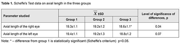 Background Retinopathy of prematurity (ROP) is one of the leading causes of bilateral blindness and visual impairment in premature infants in the world (CRYO-ROP trial 1990), which is not always related to previous disease-associated alterations [3]. Patients with favorable treatment outcome are also at high risk of ophthalmic pathology. Among eye diseases, myopia has a special place [9]. The Multicenter Study of the Early Treatment for Retinopathy of Prematurity (ETROP) has shown that 60% of patients, who had undergone early laser photocoagulation, developed visual acuity worse than 20/40 and 29% of patients had unfavorable outcomes (visual acuity worse than 20/200) [10]. Premature infants, to a greater extent, can be affected by myopia in early infancy and early childhood, opposite to full-term newborns, for whom hypermetropic refraction is common. In 1992, Quinn and colleagues showed that, in 20 % of premature infants with birth weights of less than 1251 g and with a self-regressing form of ROP, myopia developed within the first two years of life; high myopia (> 5.0 D) was observed in 4.6% [16]. It is crucial to understand the mechanism of refractive error development and progression in premature infants with ROP for searching for new treatment approaches and consulting parents on the further course of the disease. Today, researchers associate myopia with prematurity, ROP, and laser photocoagulation sequelae [6, 18]. However, the major cause of development and progression of a refractive error is still unclear [3, 15]. Therefore, to determine the cause of myopia it is necessary to identify the changes in a biometric profile of premature infants’ eyes in early infancy and early childhood. The purpose of the present paper was to assess the incidence of refractive errors in groups of premature infants, aged 1 to 3 years, without ROP, with self-regressive ROP, and ROP treated with laser photocoagulation (LP). Material and Methods Ophthalmological examination findings of 175 premature infants were studied. The study was carried out on the basis of Policlinic of SI “The Filatov Institute of Eye Diseases and Tissue Therapy”. Over stipulated time periods, all infants were examined for ROP at Department of Prematurity Pathology and Department of Neonatal Reanimation and Intensive Therapy. The stage and severity of ROP, if occurred, was classified according to the International Classification of ROP (ICROP, 2005) [11]. The infants with scarring Stages 4 and 5 were excluded from the study. Within the period between 6 months and 3 years, the children underwent standard ophthalmological examination which included physical examination, visual acuity testing, tests for strabismus, assessment of eyeball movements and convergence, wet retinoscopy for clinical refraction (double instillations of 0.5% cyclopentolate), ultrasound scanning, fundus ophthalmoscopy, and ultrasound biometry. Axial length (AL) was measured during the outpatient examination. The findings were analyzed in three groups based on the main diagnose: group 1, children without ROP; group 2, children with spontaneously regressed ROP; group 3, children with ROP, treated with retinal laser photocoagulation of avascular zones. MedCalc v.17.4 (MedCalc Software bvba, 1993-2017) was used to statistically process the data [1,13]. In analysis of qualitative attributes, the results are given as percentage values and their standard errors (±m%). Scheffe's Test for multiple comparisons was used to reveal statistical differences between means in normally distributed data. Results Based on ophthalmic examination, 175 children were divided as follows: group 1, 111 children (63%) without ROP; group 2, 42 children (24%) with simultaneously regressed ROP; and group 3, 22 children (13%) with ROP treated with LP. At the first study phase, we measured AL in the premature infants, aged 6 months to 3 years, in the three groups. A statistically significant difference was revealed in the AL values in group 3 compared to values in groups 1 and 2 (p=0.04). Table 1 demonstrates Scheffe's test data on the AL values. The mean value and 95% CI are given for right and left eyes.
