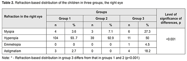 At the second study phase, we distributed the children according to diagnosis in the right and left eyes in the three groups. Tables 2 and 3 demonstrate that refraction-based distribution in group 3 statistically significantly differed from that in groups 1 and 2 (p<0.001).