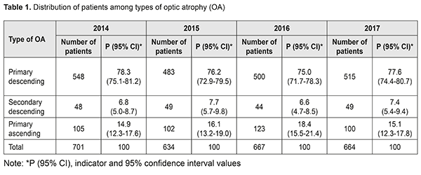 Introduction Optic atrophy (OA) holds a special place among eye disorders due to its severity and frequently leads to substantial loss of vision. OA (with the ICD-10 code of Н47.2) is an optic nerve disorder with a stable loss of visual function due to organic destruction of retinal ganglion cell axons and their myelin sheath, which results in blocking the conduction of nerve impulses. Optic atrophies show histologic changes such as nerve filber destruction, retinal ganglion cell degeneration, demyelination and vascular obliteration [1-3]. In addition, OA is a disease of multiple etiologies and is a consequence of various pathological changes along the optic pathway. Atrophic changes may result from degeneration, edema, impaired circulation, and compression of or traumatic damage to the optic nerve and its supplying vessels. A wide variety of etiologic factors may cause the disease, with the largest group of factors related to central nervous system (CNS) pathology. Brain neoplasms such as tumors in cerebral hemispheres, chiasmal and sellar region, posterior fossa, and cerebellum may have a pathologic influence on the optic pathway even in early stages of development. In direct optic nerve compression (most commonly, at the chiasm), compression of nerve fibers and primary descending OA develop. In tumors in cerebral hemispheres and/or hydrocephalus, the intracranial pressure rises, and papilledema develops, with subsequent transformation to secondary optic nerve atrophy. OA may also develop in subarachnoid hemorrhage, cerebral aneurysm, severe craniocerebral injury, and inflammation of the brain or its tunics. Demyelinating disorders (multiple sclerosis, multiple encephalomyelitis, and Devic's disease) cause retrobulbar optic nerve sheath inflammation which may also lead to OA. Ascending OA develops in acute and chronic vascular impairments, optic nerve inflammation, and central and peripheral retinal degeneration. Identification of the etiology of OA is important in the clinical practice to select the pathogenetic treatment, since management strategy for patients with OA varies depending on the presence of brain neoplasms, demyelination process, intoxication or vascular ocular disorders [4-8]. Systemic diseases (essential hypertension, atherosclerosis, diabetes mellitus, temporal arteritis, obliterative endarteritis, vertebrobasilar impairments in discopathy of the cervical spine, etc.) also play an important role in the development and progression of OA. In such cases, hemodynamics abnormalities, neuronal hypoxia, microcirculatory and metabolic abnormalities substantially aggravate the course of OA [4]. The purpose of the study was to investigate various etiologic factors for OA and prognostic significance of individual risk factors for OA. Materials and Methods Medical records of patients attending ophthalmologists of Neuroophthalmology Department of the Romodanov Neurosurgery Institute during 2014 to 2017 were subjected to analysis in order to investigate etiologic factors for OA. Given that OA is a consequence of various ocular and CNS disorders, patients were retrospectively divided into three groups: Group 1 (primary descending OA; 2,046 patients); Group 2 (primary ascending OA; 430 patients); and Group 3 (secondary OA; 190 patients). 95% confidence intervals (CI) reflecting the expected range for counts related to individual OA types were used to determine assessment accuracy. To investigate risk factors for OA, we used a case-control study (with comparison between groups with and without OA for prevalence of individual factors) and relative risk assessment. Medical records of 160 patients with OA and 400 patients without OA but with any other eye pathology who were consulted at the Neuroophthalmology Department were retrospectively examined. The assessment of results was based on odds ratios (OR) and 95% CI due to retrospective analysis of risk factors. Results Most (75.0%-78.3%) study cohort patients demonstrated descending OA associated with neurosurgical and/or neurological disorders during 2014 to 2017. This can be explained both by the prevalence of the pathology and by the specialty of the medical facility. The percentage of patients demonstrating ascending OA (due to eye pathology) varied from 14.9% in 2014 to 18.4% in 2017. Secondary OA was found in 6.6%-7.7% of study cohort patients. They had a history of papilledema of various etiologies (neoplasms, trauma, or benign intracranial hypertension) (Table 1). Here it is neurosurgical pathology in the context of which we consider secondary OA (i.e., due to raised intracranial pressure caused by tumors or other factors). Secondary OA, if present, is an unfavorable sign for visual prognosis and sometimes even for survival, and evidences late diagnosis of underlying disease. Visual functions are commonly substantially impaired and cannot be restored in such patients. In the presence of cerebral tumors, the goal of the ophthalmologist is early diagnosis of fundus signs of intracranial hypertension for prevention of secondary optic atrophy.