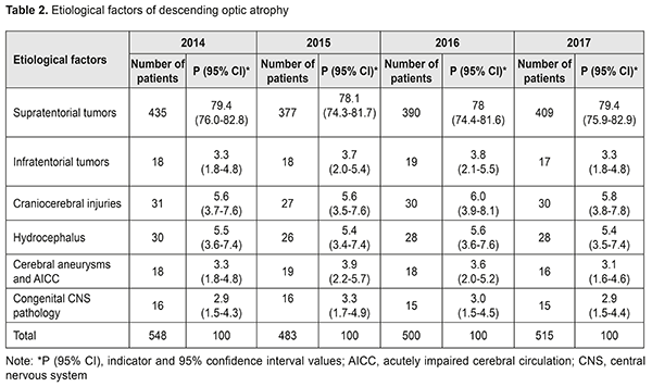 We conducted in-depth analysis of the causes of descending OA in study patients for the period of 2014 to 2017. The vast majority (up to 82.7%) of cases of descending OA were associated with brain neoplasms (Table 2). It should be noted that brain neoplasms were classified by location into infratentorial and supratentorial. Supratentorial tumors were found to be the most common cause of descending OA. Most commonly, these were pituitary adenomas, craniopharyngiomas and tuberculum sella meningiomas. This can be explained by close proximity of these neoplasms to the chiasm, optic nerves and optic tracts. The tumor may compress the optic nerve directly at the sella turcica and result in chiasmal syndrome and subsequent OA. Of the tumors that caused OA in study cases, 90.0% to 96% were supratentorial. Thus, of the 483 cases of descending OA registered in 2014, 435 (90.0±1.3%) were caused by supratentorial tumors. In addition, of the 426 cases of descending OA registered in 2017, 409 (96.0±0.0%) were caused by supratentorial tumors. Therefore, percentage of descending OA caused by supratentorial tumors statistically significantly increased with time, which requires attention.