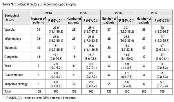 On the other hand, percentage of descending OA caused by infratentorial tumors was found to decrease from 10.0±1.3% in 2014 to 4.0±0.9% in 2017. The pathology is manifested as sequelae of the remote pathological process. Compression of the optic nerves and tracts take place due to expansion of the ventricular system or dislocation of brain structures. The identified features can be explained by the fact that, the diagnosis, especially, early diagnosis of raised intracranial pressure has become simpler and more accurate in recent years. In addition, descending OA is accompanied by the prominent general symptoms (headache and neurological impairments). Craniocerebral injury (≤6.0%) and hydrocephalus (≤5.6%) were the second and third most common causes of descending OA, with no significant difference between them or between years of assessment. The same can be said with regard to the least common causes, cerebral aneurysm and acutely impaired cerebral circulation (≤4.0%) and congenital CNS pathology (≤3.0%). Etiologic factors of ascending OA were subjected to analysis (Table 3). The number of patients with ascending OA (430) was substantially less than that of patients with descending OA. The former patients were referred to the institute for exclusion of neurosurgical pathology and differential diagnosis. In these patients, vascular factor (a consequence of acutely or chronically impaired optic nerve circulation, retinal vein or arterial occlusion) was the most common (27.6%-30.1%) etiologic factor, followed by optic nerve inflammation (papillitis or neuritis; 25.5%-28.5%). Retrobulbar neuritis is closely associated with demyelinating disorders of the nervous system. That is, more than half (54% to 58.6%) of cases with OA were attributed to the two above causes. In addition, traumatic (16.3-18.6%) and congenital (14.6-17.1%) factors were the third and fourth most common etiological factors in patients with ascending OA. Toxic (2.9%-4.9%) and glaucomatous (2.9%-4.1%) factors were practically equally common in ascending OA; each of them accounted for a share of 3.0% in 2017.