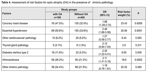 What draws attention is a rather high percentage of cases with idiopatic etiology of ascending OA (5% in 2014 and a 4.1% higher percentage in 2017). This trend indicates that there are still some problems with the diagnosis, and emphasizes the relevance of the issue. The pattern of distribution among the three groups (primary descending OA, secondary descending OA, and ascending OA) practically did not change during the period for assessment. This was confirmed also by the structural change coefficient (1.13%) for etiological factors of optic atrophy. A comprehensive approach is relevant to the study of OA because the latter is a disease of multiple etiologies, and various factors can influence the development and course of the disease. We conducted a study of the risk factors for OA. Our population-based cohort study involved both a case-control (the group with OA versus the group without OA) comparison for prevalence of individual factors and relative risk assessment. We found that a comorbid disease plays a statistically significant role in the formation of OA. Specifically, coronary heart disease, essential hypertension, diabetes mellitus type 2, and atherosclerosis were found significantly more frequently in patients with than in those without OA (47.5% vs 32.5%, 55.6% vs 33.8, 11.9% vs 5.5, and 36.3% vs 21.3, respectively, р=0.0002). The obtained data made us determine odds ratios (ORs) for the likelihood of developing OA in the presence of a given comorbid disease. The ORs for developing OA were 1.88 (95% CI = 1.29 to 2.73) for the presence of coronary heart disease, 2.46 (95% CI = 1.69 to 3.58) for the presence of essential hypertension, 2.32 (95% CI = 1.22 to 4.41) for the presence of diabetes mellitus type 2, and 2.11 (95% CI = 1.41 to 3.15) for the presence of atherosclerosis. Patients with comorbid thyroid gland disorders or chronic pathology tended to have an increased risk of developing OA, although the difference was not significant (Table 4).